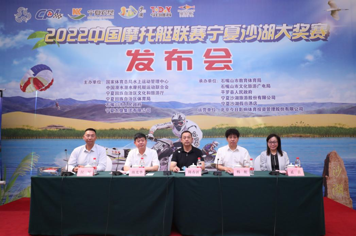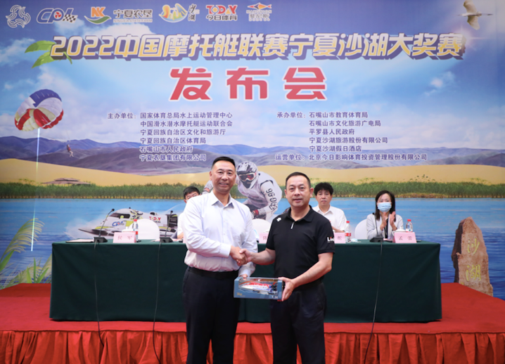7月6日,组委会在北京召开赛事新闻发布会,国家体育总局水上运动管理中心副主任陈春新;宁夏农垦集团党委委员、副总经理杨舵;石嘴山市教体局党组书记、局长陈光华;宁夏沙湖旅游股份有限公司党委副书记、总经理侯军;北京今日影响体育投资管理股份有限公司董事长孟蕾等领导出席,会上国家体育总局水上运动管理中心、石嘴山市人民政府、宁夏沙湖旅游股份有限公司及北京今日影响体育投资管理股份有限公司共同签订了《建设全国水上国民休闲运动中心战略合作框架协议》,开启沙湖文体旅融合发展新篇章;随后,国家体育总局水上运动管理中心向沙湖景区代表赠送了联赛官方纪念品,感谢赛事承办方对水上运动的支持。