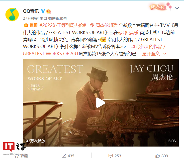 IT之家 7 月 6 日消息,7 月 6 日,B站发布周杰伦新歌 MV《最伟大的作品》,宣布与杰威尔音乐达成版权合作。时隔 6 年,周杰伦推出新专辑《最伟大的作品》(点此观看),与专辑同名的新歌也同步亮相,未来更多新专辑内歌曲 MV 将于B站发布。同时,B站还即将上线 Hi-Res 无损音质功能,为观众提供更优质的视听体验。