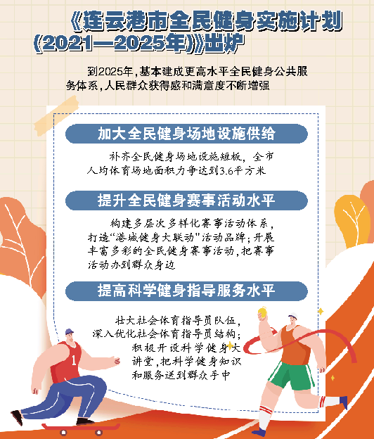 生命在于运动,没有全民健身就没有全民健康,没有全民健康就没有全面小康。如何将全民健身热潮进一步推向纵深发展,近期印发的《连云港市全民健身实施计划(2021—2025年)》(以下简称《实施计划》)给出了答案。到2025年,我市将基本建成更高水平全民健身公共服务体系,人民群众获得感和满意度不断增强。