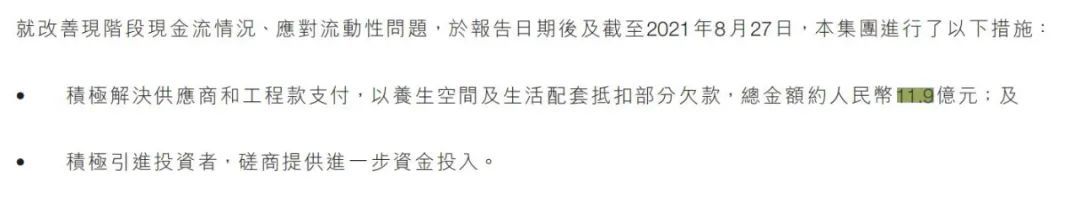 一是,以养生空间及生活配套抵扣部分欠款,总金额约人民币11.9亿元;
