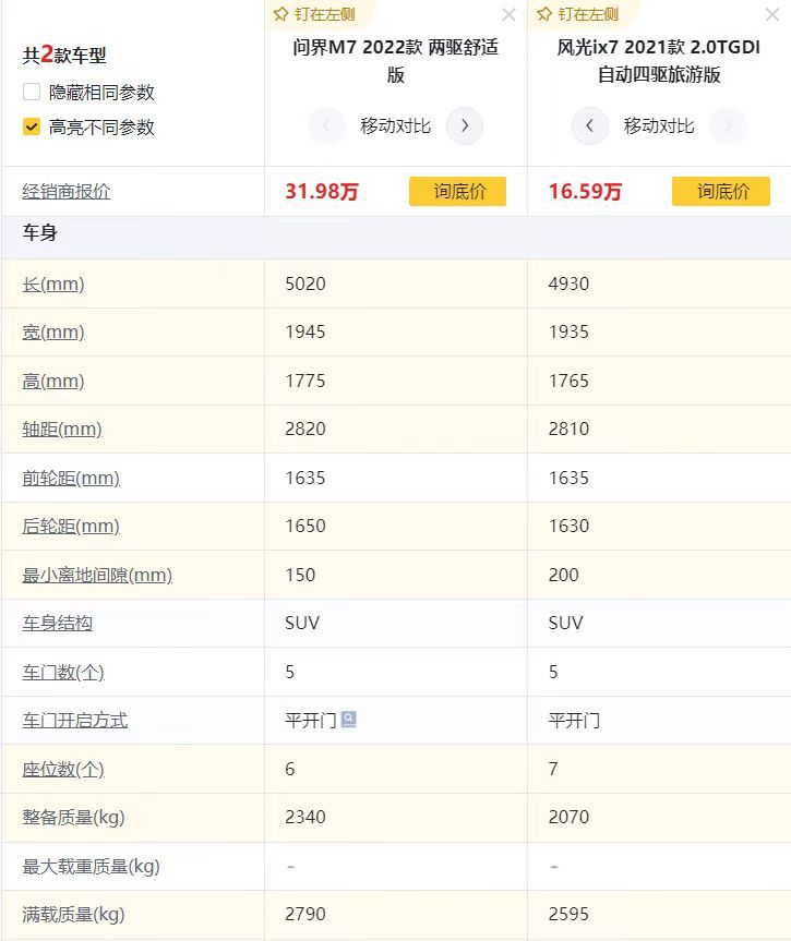 车见万宜讯—7月4日,AITO问界M7亮相并公布售价,共推出3款车型,售价为31.98-37.98万,定位于中型SUV,主打6座布局。新车发布后仅仅4个小时订单就突破了2万台,可谓走到了消费者的心坎上。但是车见君看着这车的外观,怎么都觉得有点眼熟。没错!就是东风赛力斯同门产品,东风风光ix7。相似的外观让不少消费者将问界M7称为“油改电版的风光ix7”。