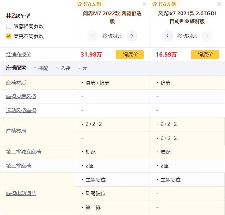我们再从座椅布局上来看,问界M7采用2+2+2的布局,而风光iX7的布局是2+3+2和选配2+2+2布局,在座椅结构布局上,问界M7为了追求百万级别的舒适感,显然2+2+2的布局是最为合理的。