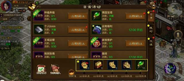 日常任务都通过点击游戏界面上方的“日常”按钮打开相关任务界面,然后点击具体的任务种类就可以实现自动寻路完成。