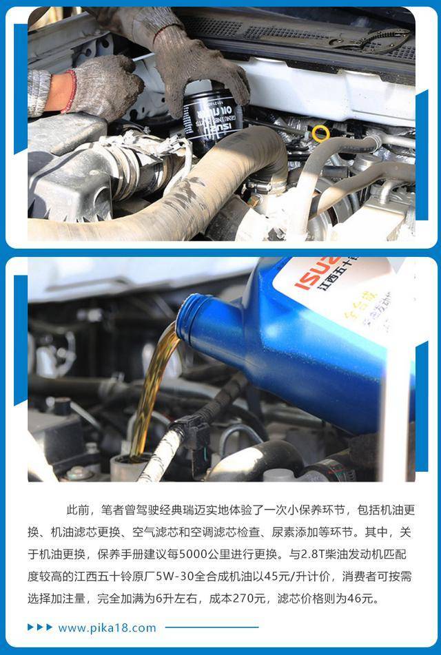 假设一位车主年均驾驶里程为2万公里,那么每年保养费用可以控制在2000元以内,约合人民币0.1元/公里。据统计,经典瑞迈平均百公里油耗约为8.14升,按近期柴油价格9元计算,平均每公里油耗费用0.73元,保险费用5950元(首年,逐年递减),综合每公里费用为1.1元,用车保养成本可谓相当低廉。