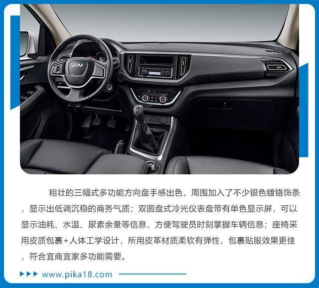 配置方面,新车配备ABS+EBD、倒车雷达、主/副驾驶座配备双安全气囊、带空气调节/花粉过滤功能的电动空调、电动车窗、行车自动落锁、高位刹车灯、溃缩式转向柱、等多项实用配置,配置丰富不冗余,实用性较高,符合宜商宜家需求。高配车型还拥有8寸中控彩色大屏、车机互联、遥控钥匙、电动调节外后视镜等进阶配置,相比同级别产品更加精致、更具档次感。