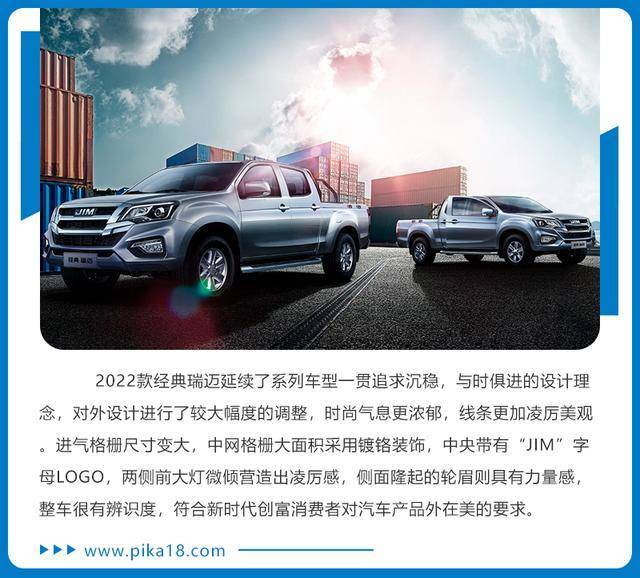 合资品质叠加国际领先技术储备,辅以超值性价比,缔造了行业传奇,江西五十铃旗下D-MAX、铃拓、瑞迈三款产品在各自细分领域均是标杆车型。其中,经典瑞迈作为“百年创富皮卡”,是商用皮卡领域的佼佼者,凭借超大乘坐空间、超强承载能力、“老字号”经典动力、五十铃全球品质等优势特性,全面迎合中国皮卡用户对民生车的需要,是创富型皮卡的典范,自上市以来一直备受好评。