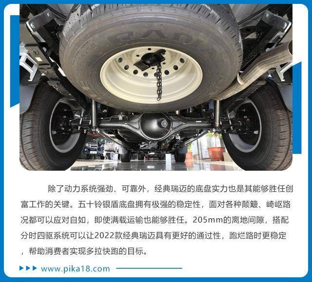 经典瑞迈研发设计之初便全面融入了五十铃基因,该车基于五十铃D-MAX同平台打造,并采用五十铃全球通用的IMM品控体系进行严格测试和品控把关,应用高科技3C1B喷涂工艺、精准总装工艺等技术,让车辆的可靠性在国内皮卡市场上名列前茅,综合产品力完全能够满足以三农行业为代表的创富用车需求。