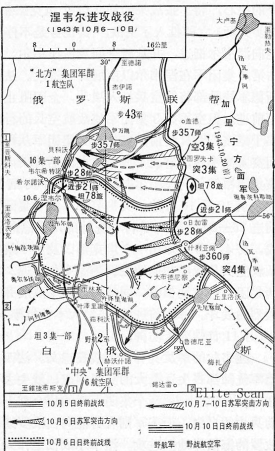而就在同一天,最高统帅部大本营也下达了新的命令,加里宁方面军必须在维捷布斯克方向实施突击,在占领该地后用主要兵力进攻波洛茨克、德文斯克和里加。西方面军应向奥尔沙和莫吉廖夫实施突击,解放两城后,继续向博里索夫、莫洛杰奇诺和维尔纽斯方向进攻。中央方面军协同沃罗涅日方面军占领基辅地域后,其主要兵力向日洛宾、博布鲁伊斯克、明斯克方向发展进攻。
