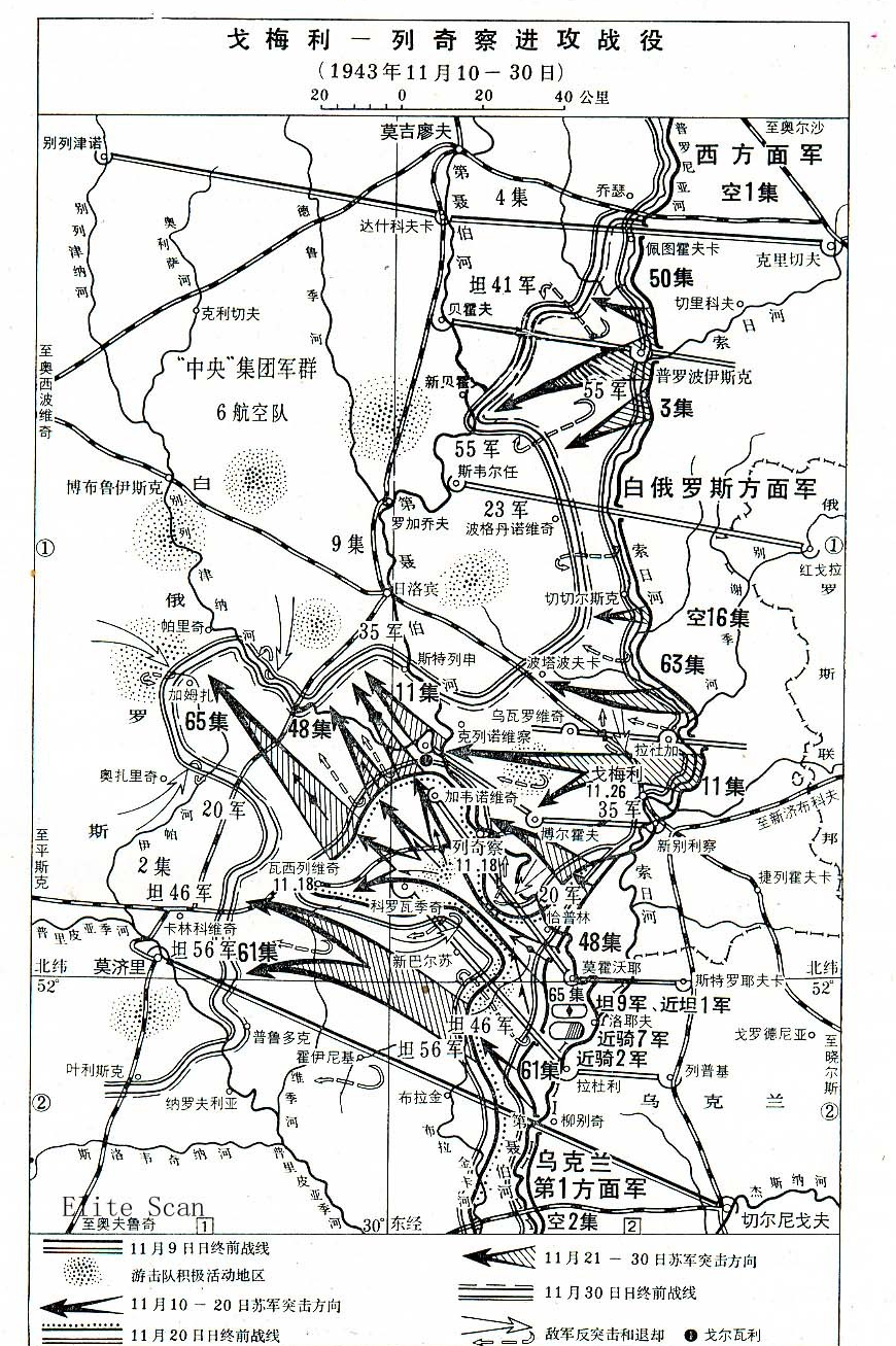 在西方面军11月的奥尔沙进攻作战同时,其南翼的白俄罗斯方面军也在1943年11月10日-11月30日发起了戈梅利-列奇察战役。11月18日解放列奇察,11月26日解放戈梅利,20天内方面军在100千米宽的正面向德军纵深推进130千米。方面军参战71.9万人(装备坦克和自行火炮247辆,火炮和迫击炮7560门、作战飞机526架),共损失88206人-纯减员21650人,伤病减员66556人;德军参战的第2、4和第9集团军(苏军数据共66万人,装备坦克和强击火炮300辆,火炮和迫击炮2600门、作战飞机400架)根据十日报告在11月11日-11月30日一共损失了17288人-亡3150人伤12013人失踪2125人。