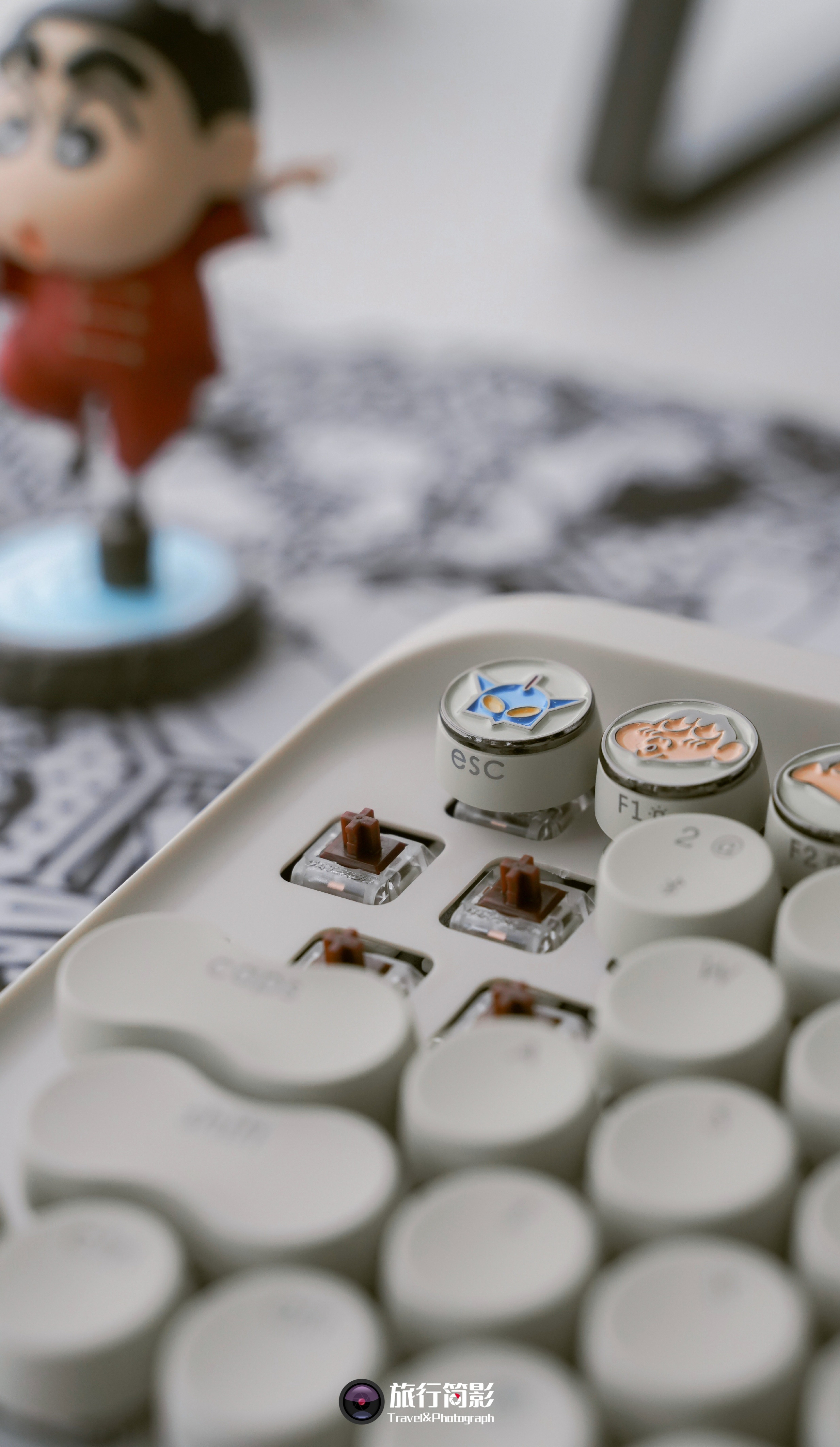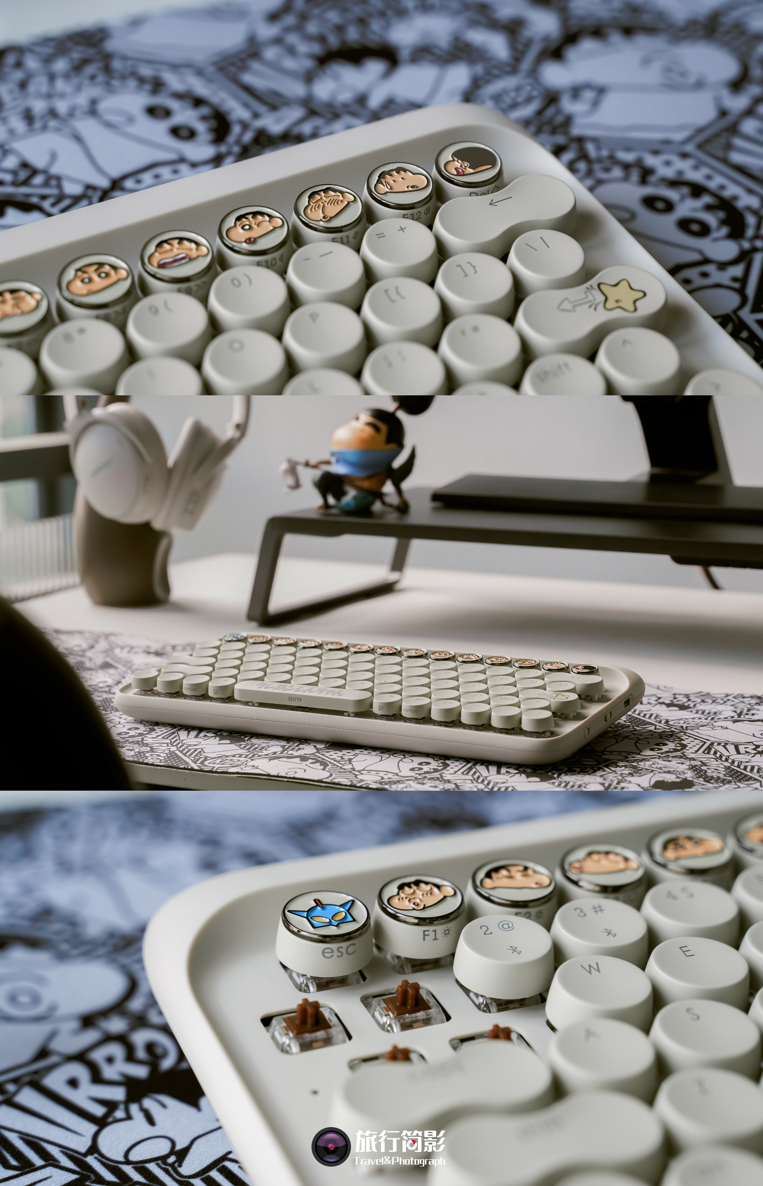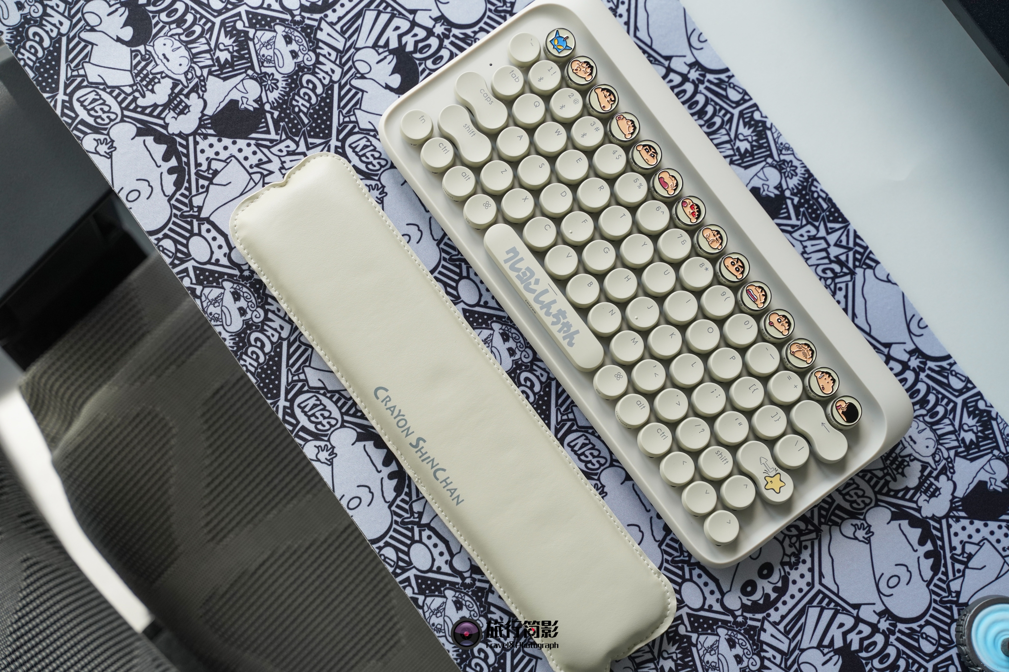 键盘整体采用了复古的灰白色,顶排的十四颗键被换成蜡笔小新金属徽章,回车键和空格键也加入了蜡笔小新相关元素。联名元素多但不乱,整体搭配非常协调,看着很舒服。