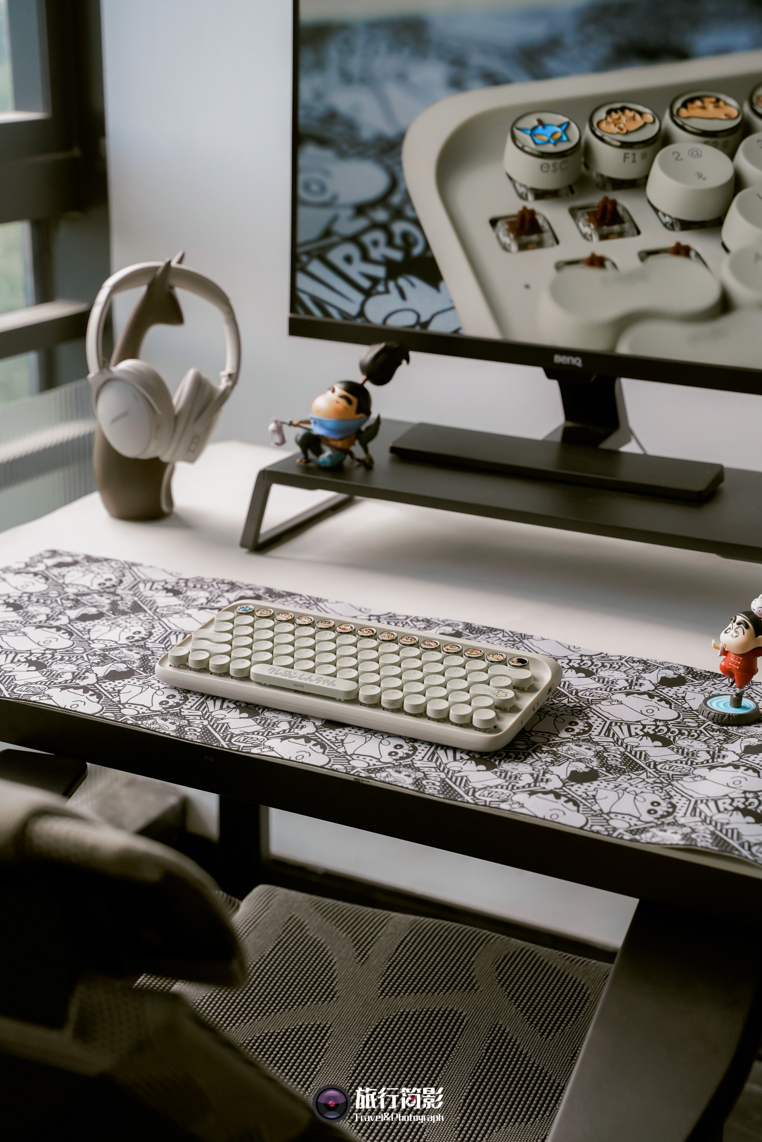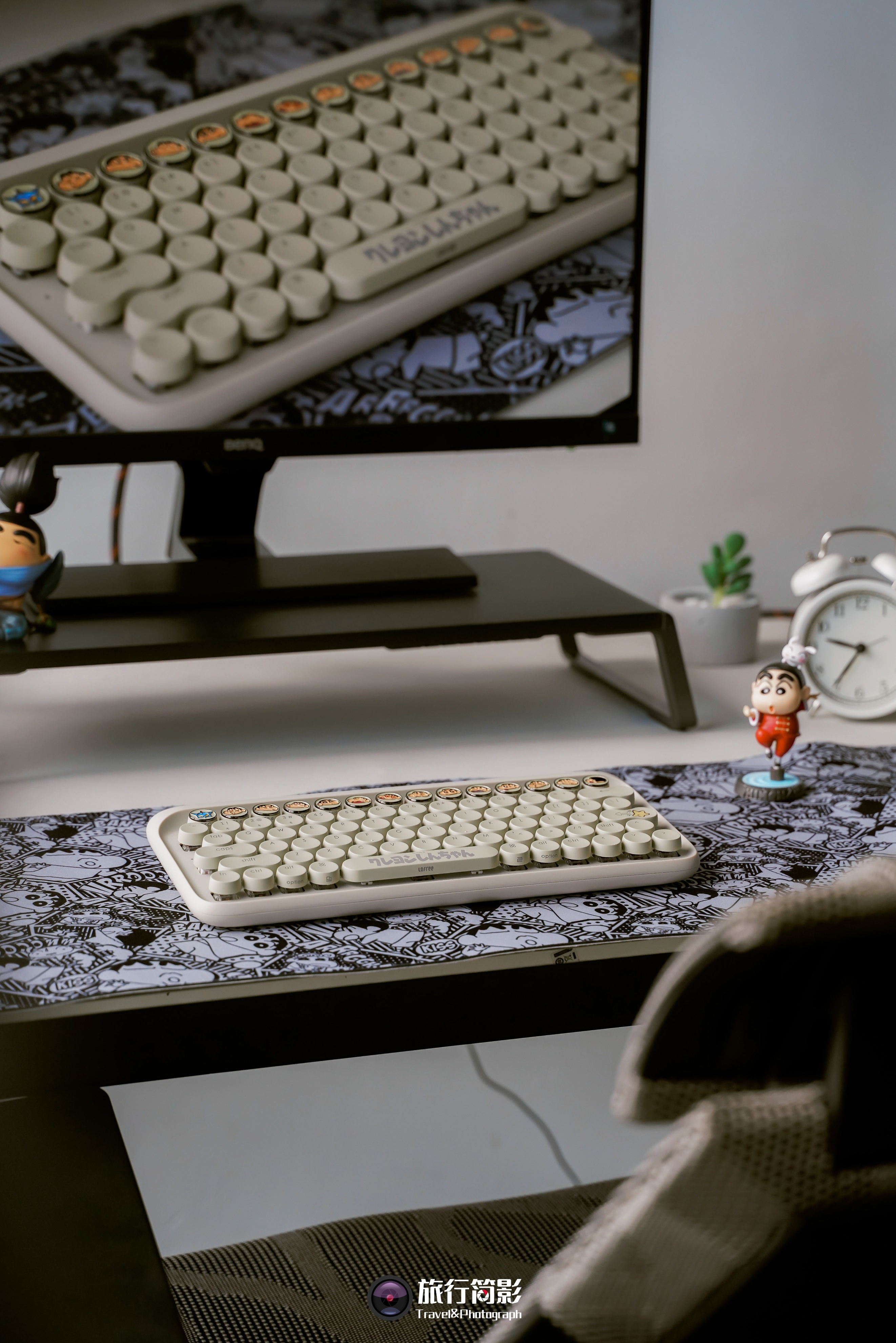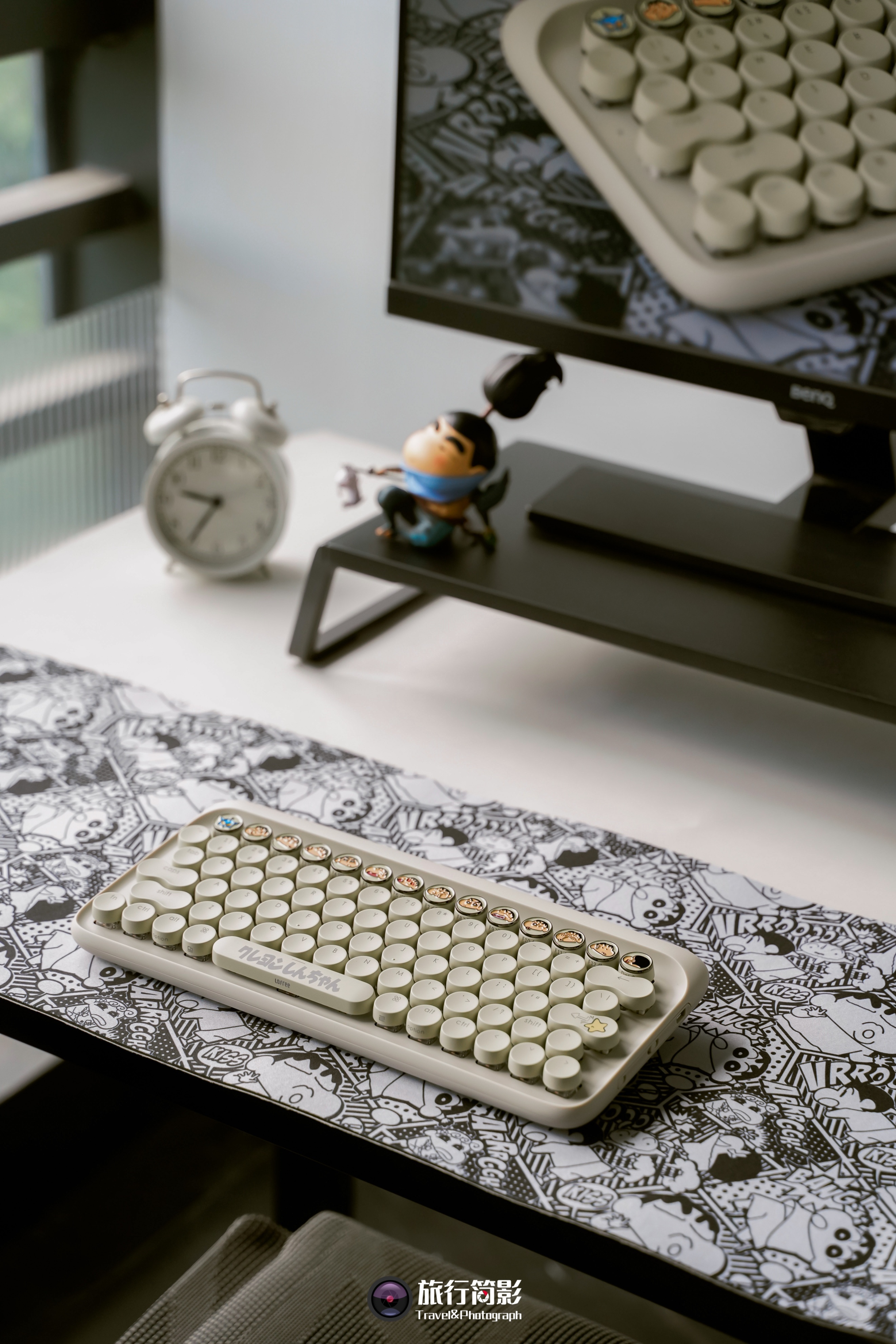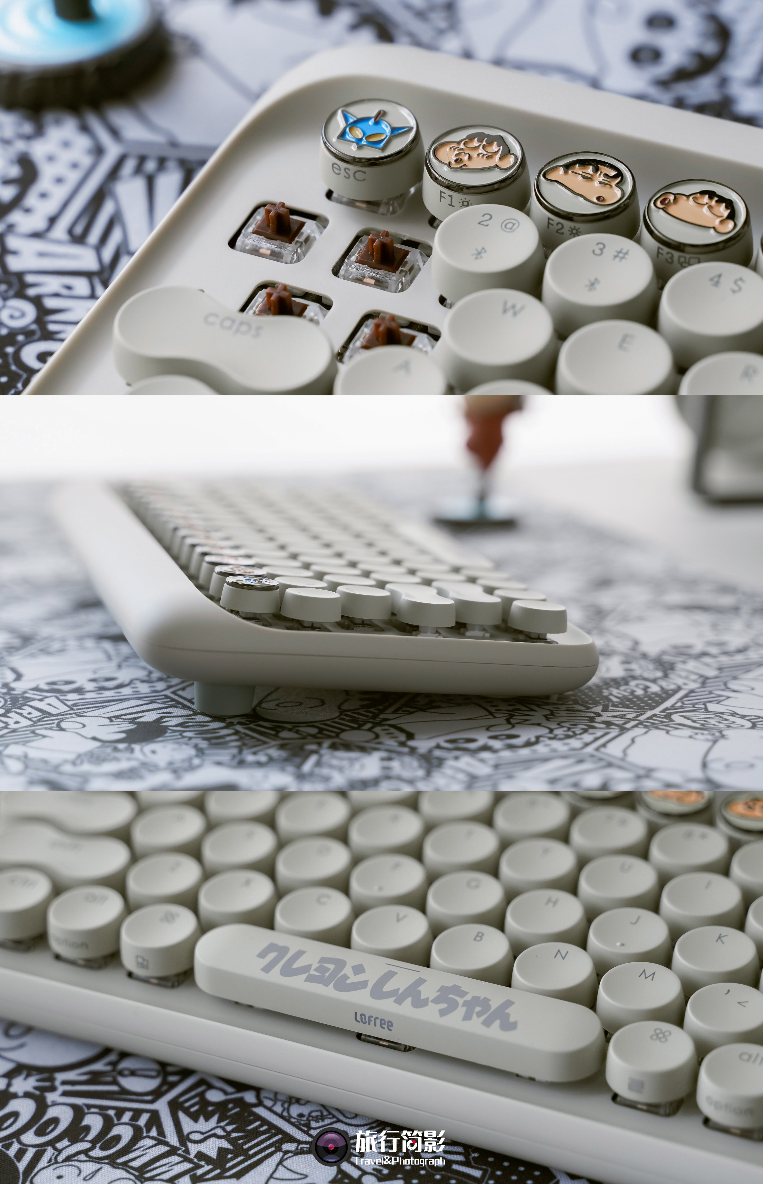 键盘整体采用了复古的灰白色,顶排的十四颗键被换成蜡笔小新金属徽章,回车键和空格键也加入了蜡笔小新相关元素。联名元素多但不乱,整体搭配非常协调,看着很舒服。
