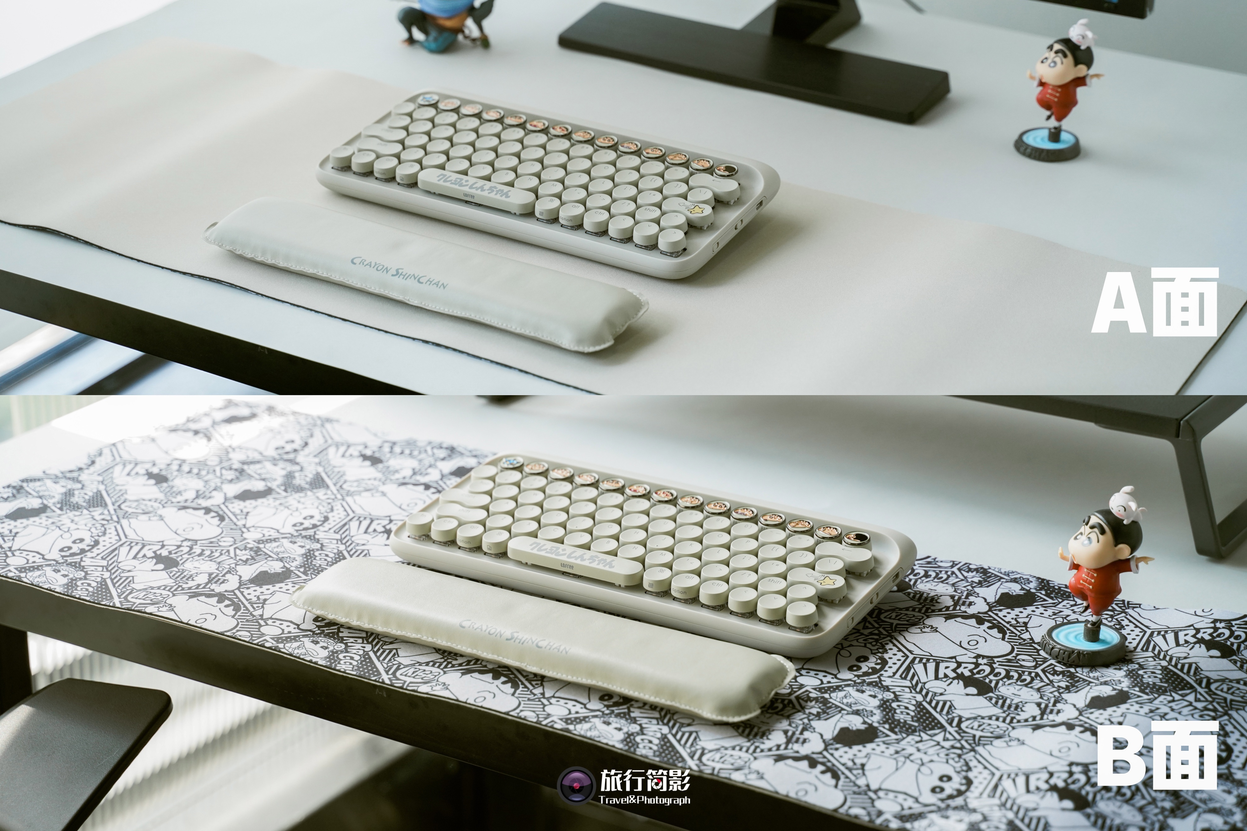 桌垫可以双面使用,一面印满了蜡笔小新,一面是和键盘同色调的纯色,可以根据个人需求选择。手枕很软很舒服,采用高弹力PU皮材质,即防水又耐磨。