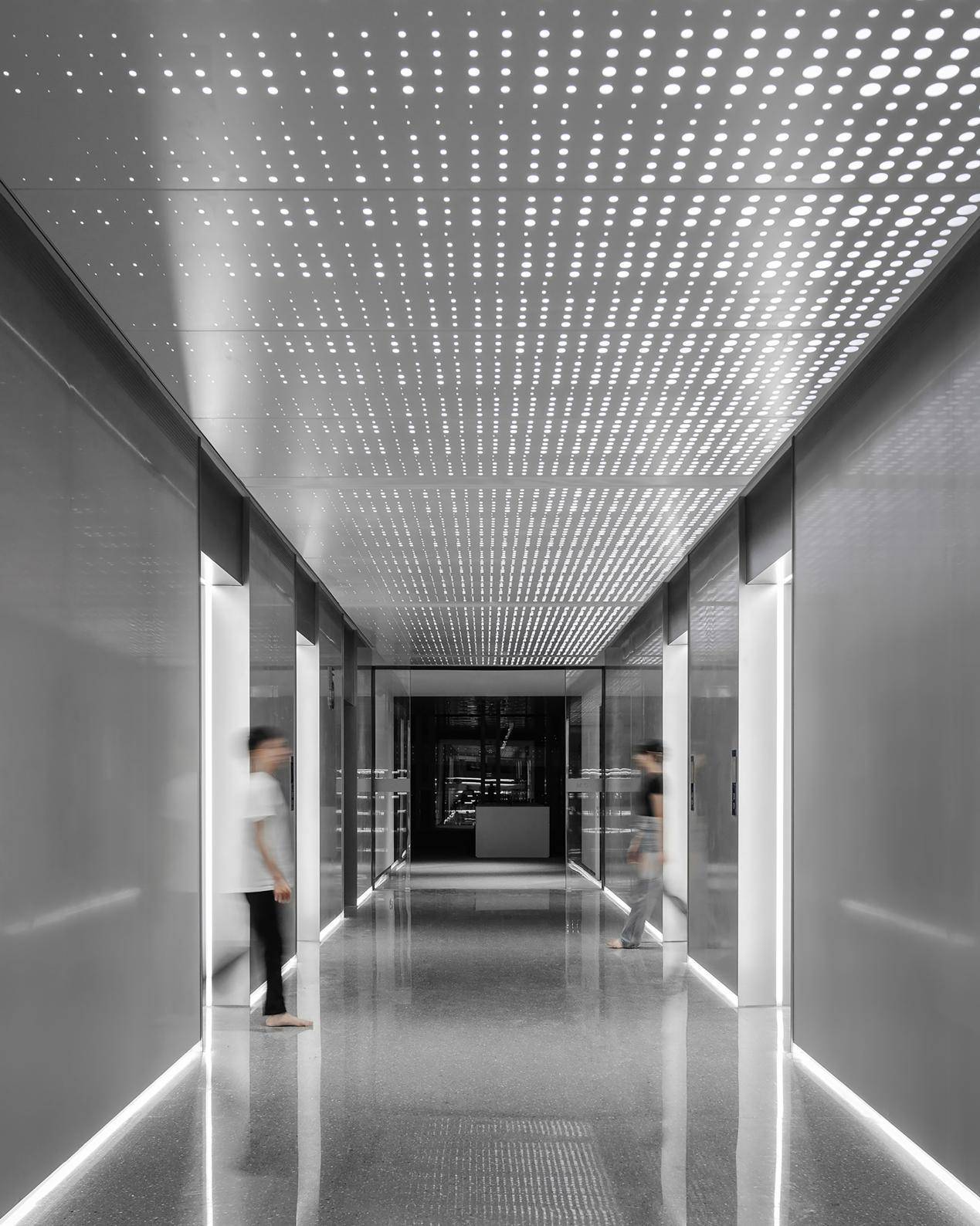 顶部两层的商务接待区,则采用了艺术馆般的极简商务风,搭载着水磨石、有机玻璃、金属不锈钢等材料的使用,将艺术格调拉满,使线条光成为主角,呈现超越时光的科技感。