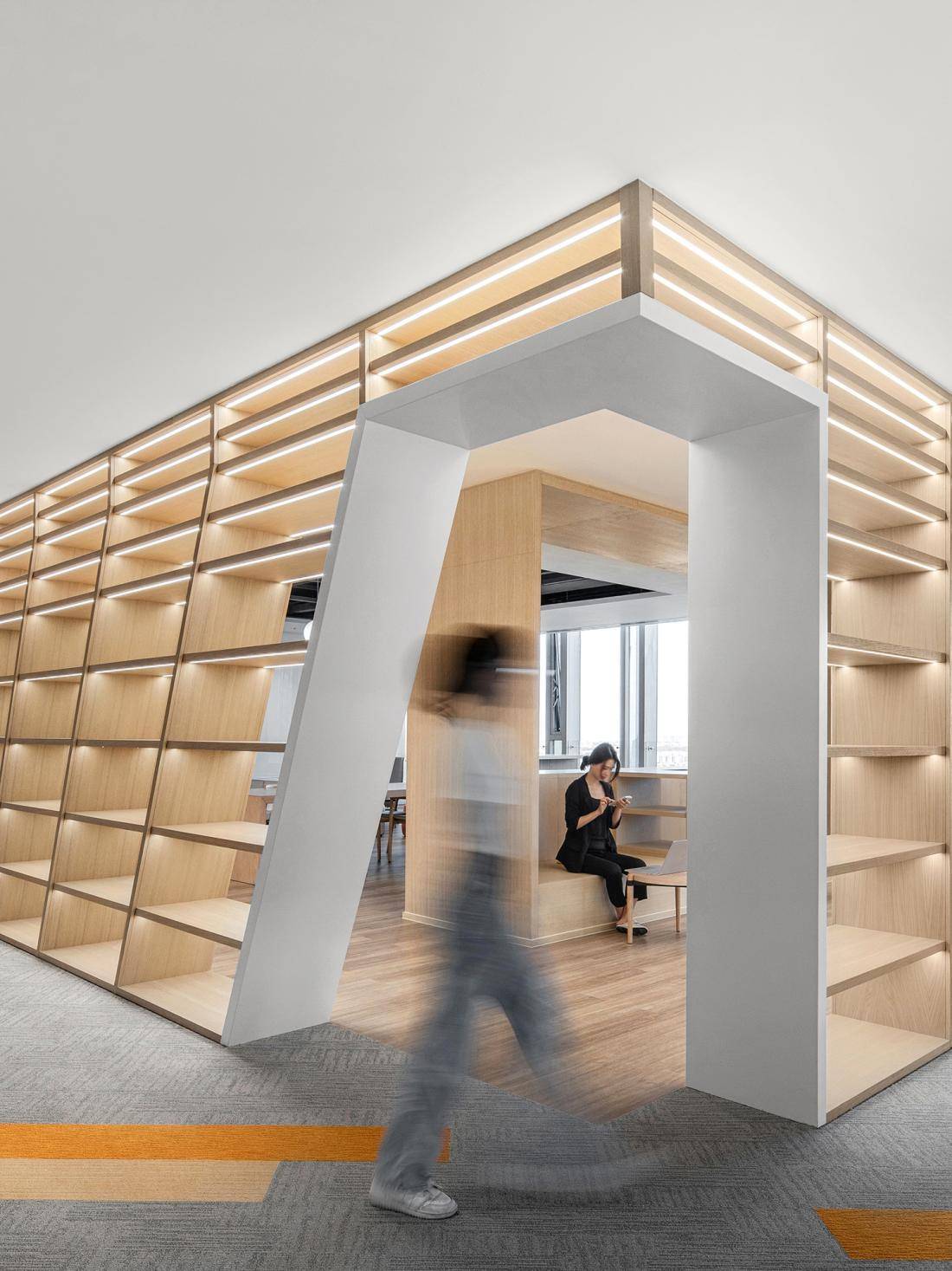 横向上,避免部门之间的交通重叠与交叉,设计师在每层设计了关键枢纽,避免了交通杂乱、空间碎片甚至是空间浪费,同时又让这个庞大的建筑体有了核心的社交聚集点,成为了这个办公项目最大的设计亮点。