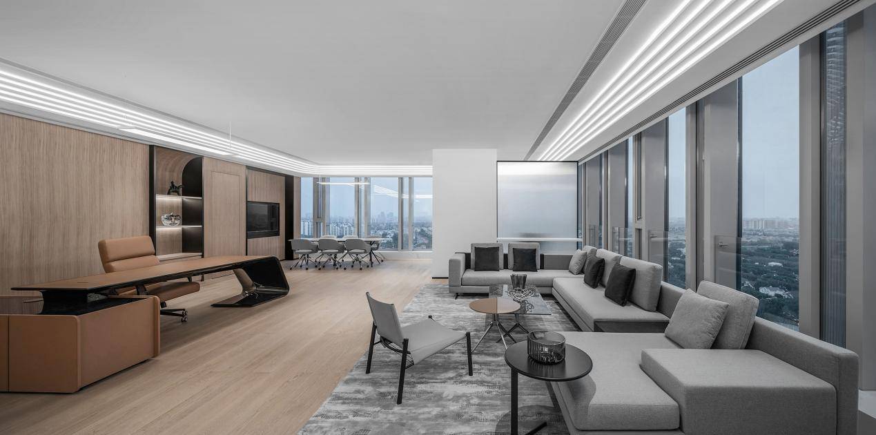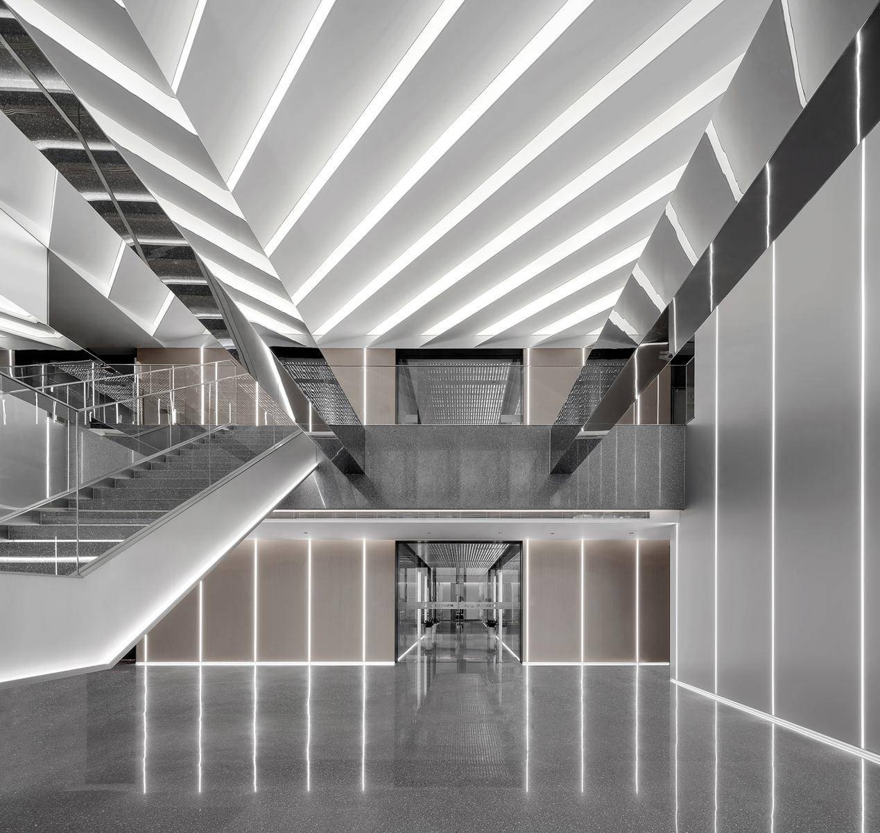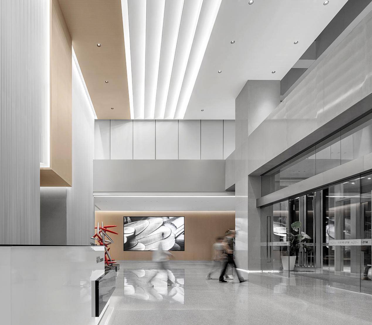 The business reception area occupying top two floors of the building adopts the minimalist business style of art museum. It takes advantage of terrazzo, organic glass, metal stainless steel and other materials to create an atmosphere packed with artistic styles, so as to let the lines of light play a leading role to present a sense of technology beyond time.