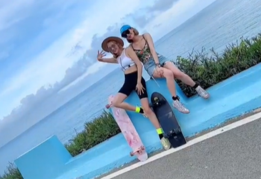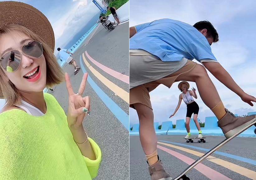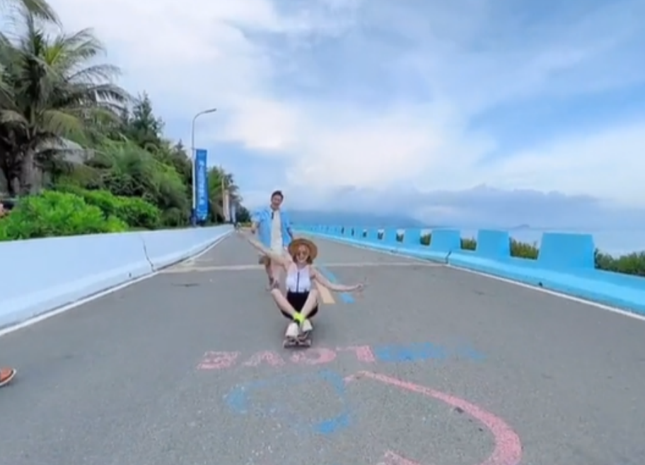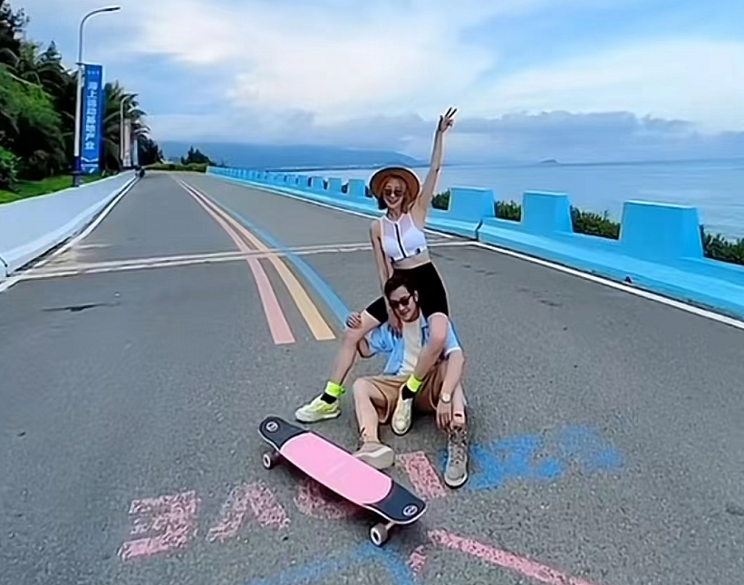 最近在海边度假的蒋丽莎一家,当天带着滑板来到了海边的公路上。蒋丽莎坐在滑板上顺着坡往下滑,陈浩民则在后面跟随,画面看上去十分美好。
