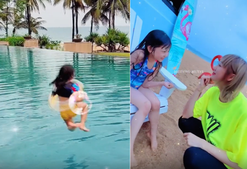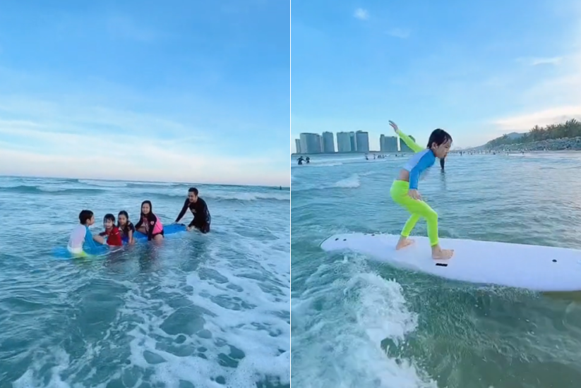 出来度假当然会带上孩子们一起,这一家子一起体验了很多项目。此前陈浩民便带着孩子们在浅海处练习冲浪,小朋友们都玩得十分开心。