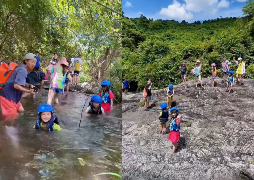 蒋丽莎还带着孩子们在当地体验了一把丛林探险,大家一起跋山涉水,看到孩子们的笑容,就知道这类活动很有意义。