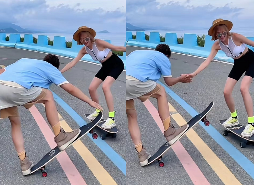 夫妻二人滑板玩得都很熟练,在视频中便玩起了许多花样。陈浩民翘起板头,跟老婆来个了击掌。蒋丽莎在滑板上弯着腰,显得十分兴奋。比二人动作更抢镜的是,蒋丽莎一双又细又直的长腿。