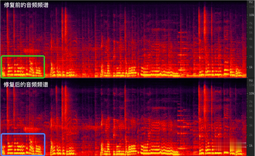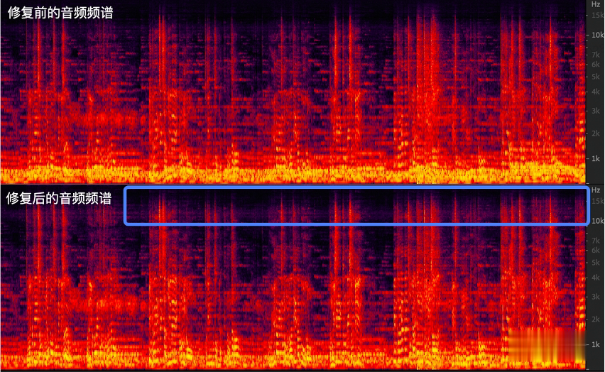 从蓝框部分可以看到,经过超分,原始音频的高频部分得到了拓展和增强。