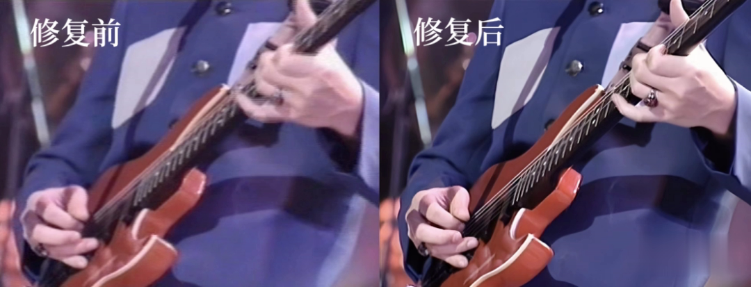 从结果来看,修复后吉他手的手部伪影完全被去除了,轮廓也清晰了起来。