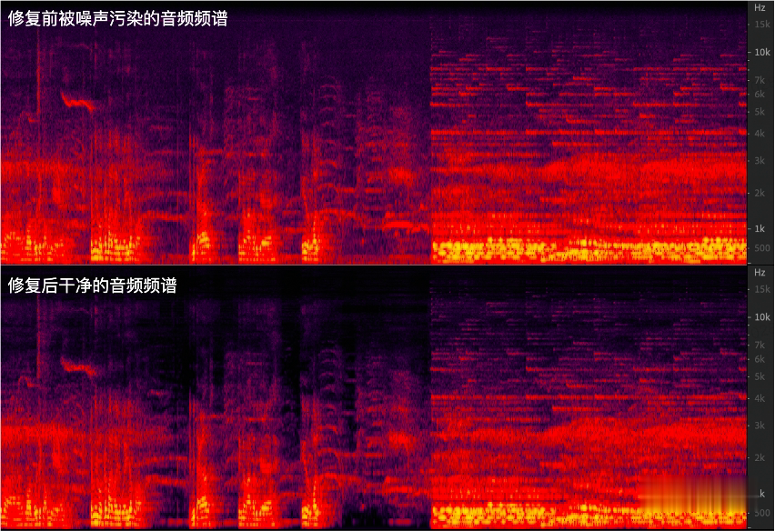 这一点在频谱图上也表现得很明显:降噪前,音频频谱较为浑浊;降噪后,频谱图清晰了不少。