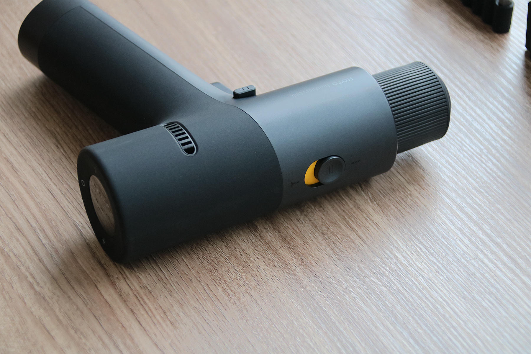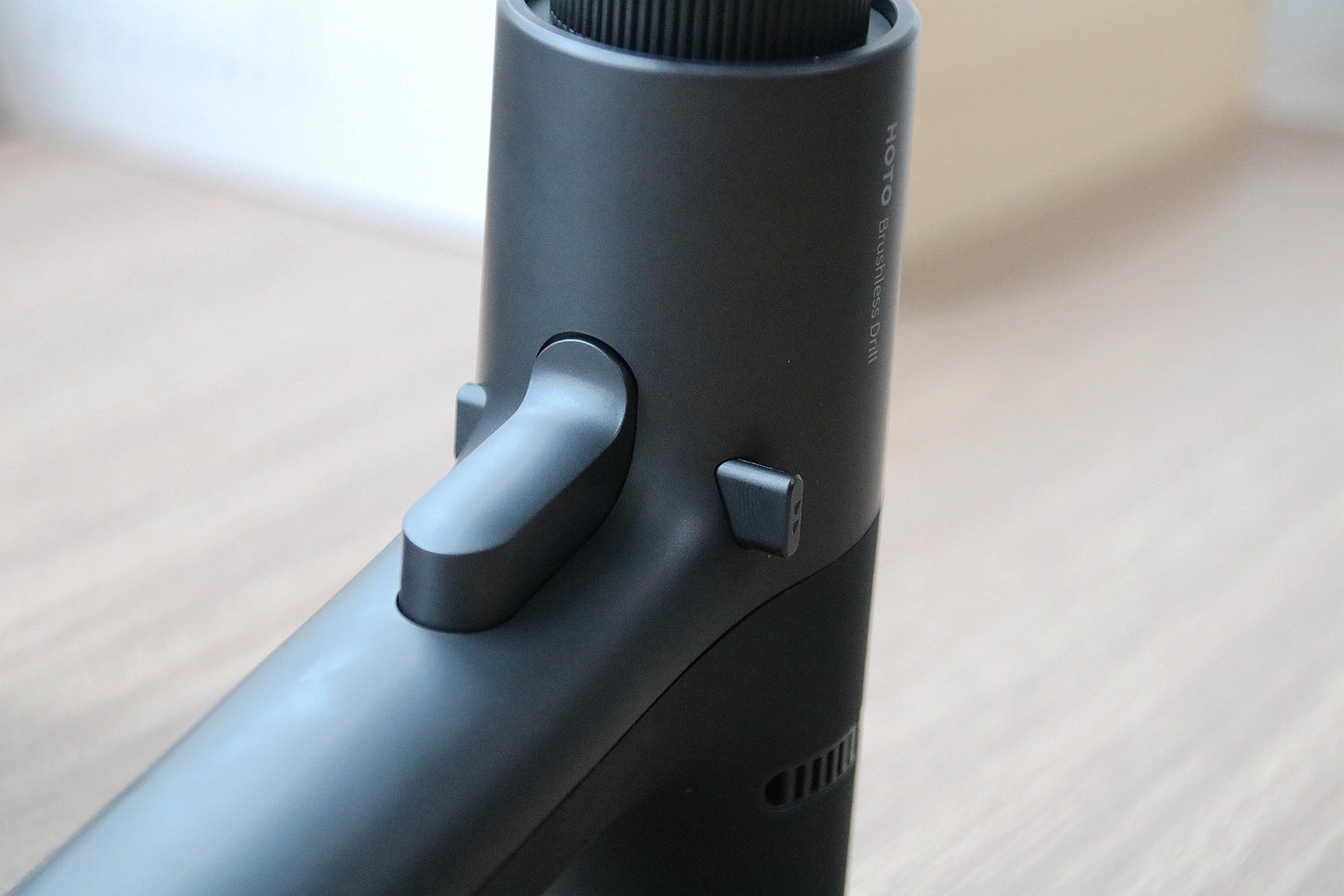 使用起来,小猴12V无刷电钻也是比较简单的,它的启动开关可以用力度控制电钻的速度,拨杆键向一边推动表示电钻往那边转动,调到中间就是关闭状态,另外电钻上还设计了一个功能拨扭,使用时我们只需根据拧螺丝或者钻孔把它拨到标示的位置即可。