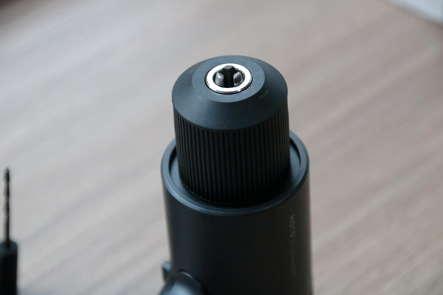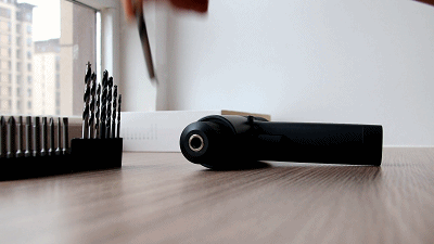 安装钻头的方法也比较简单,上面标注了方向,只需要将钻头插进去后拧动这个黑色螺纹区域将其固定即可使用,目前有两种方法装钻到,一种是纯手动,插入后手动拧紧,一种则是利用电钻转动固定钻头,方法如下面的动图所示。
