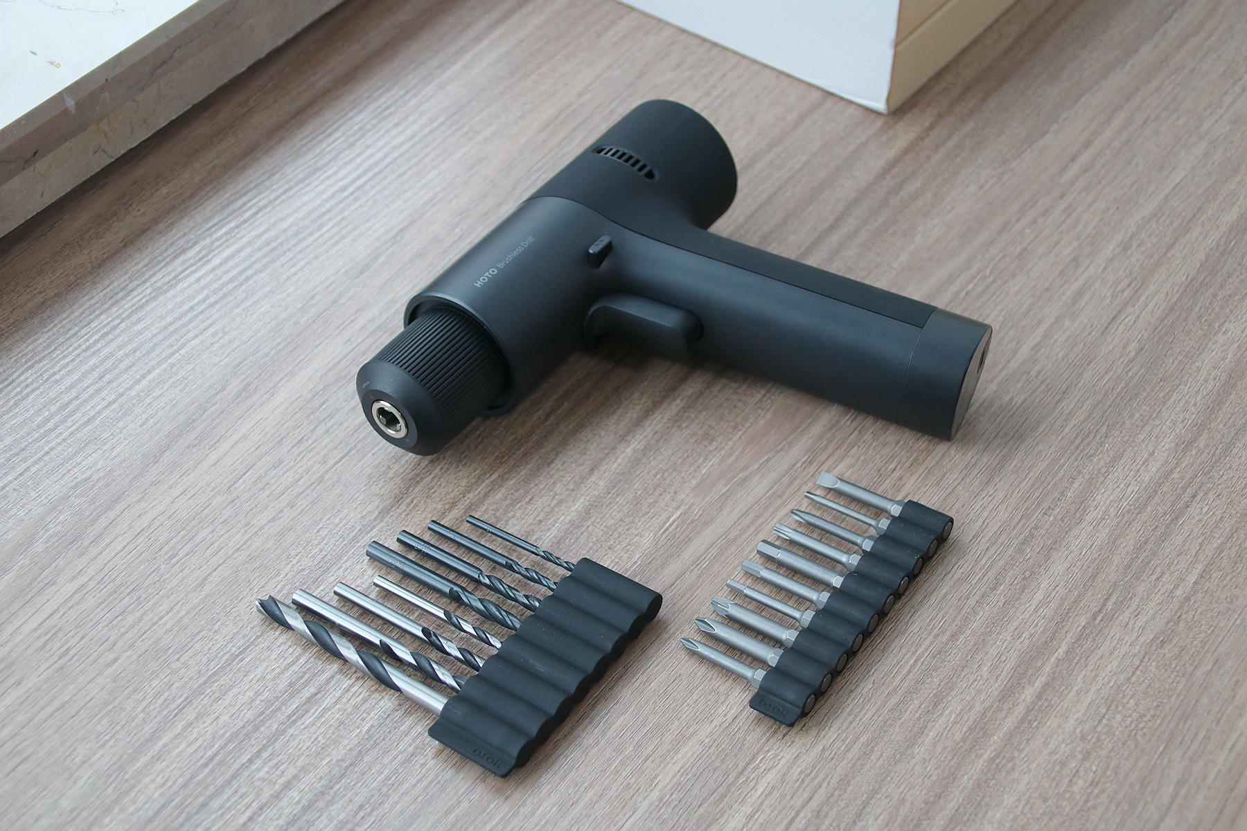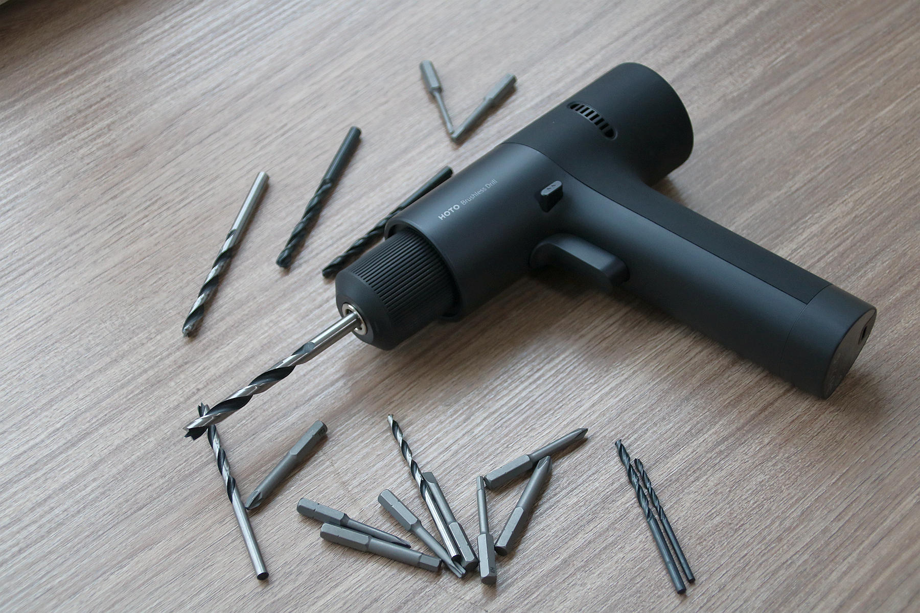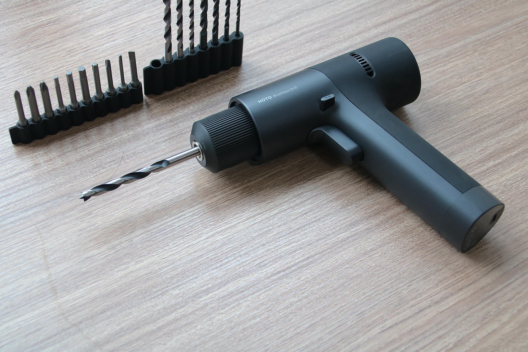 此次小猴12V无刷电钻配备的钻头有两种类型,一种是钻金属硬物材质的钻头,一种则是钻木头这种钻头,两种钻头分别都是4枚,其尺寸大小不一,我们需要钻孔时比对一下型号大小选择合适的钻头即可。