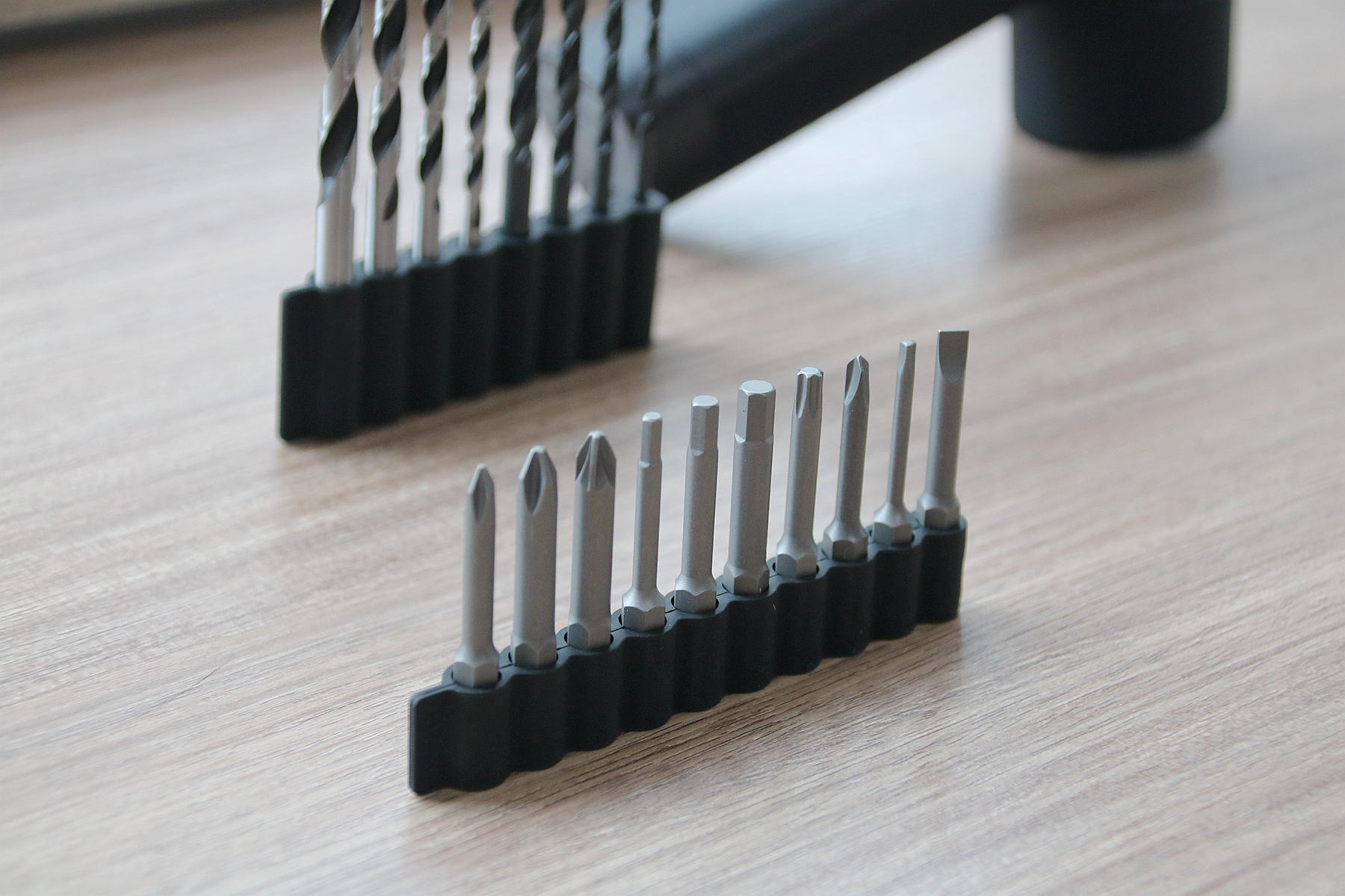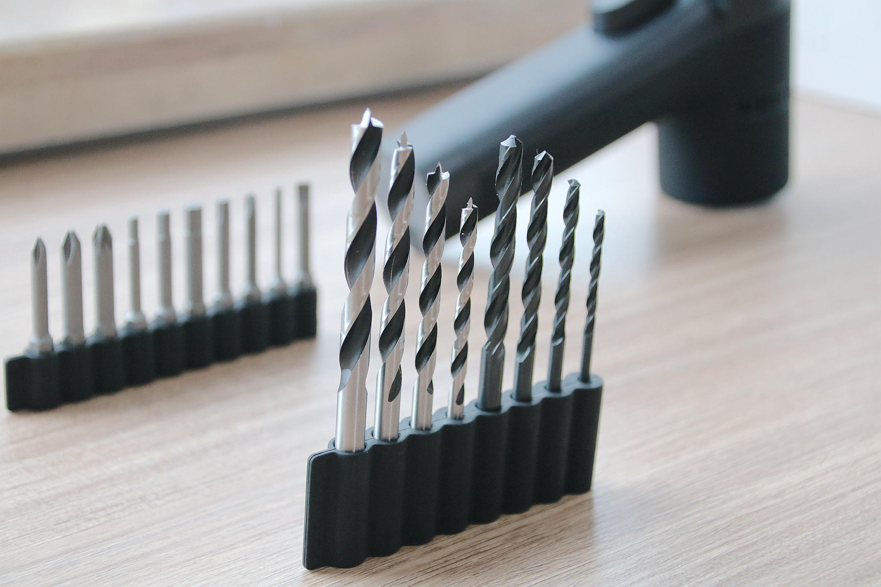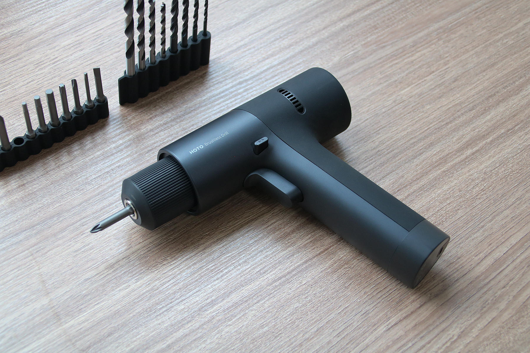 此次小猴12V无刷电钻配备的钻头有两种类型,一种是钻金属硬物材质的钻头,一种则是钻木头这种钻头,两种钻头分别都是4枚,其尺寸大小不一,我们需要钻孔时比对一下型号大小选择合适的钻头即可。