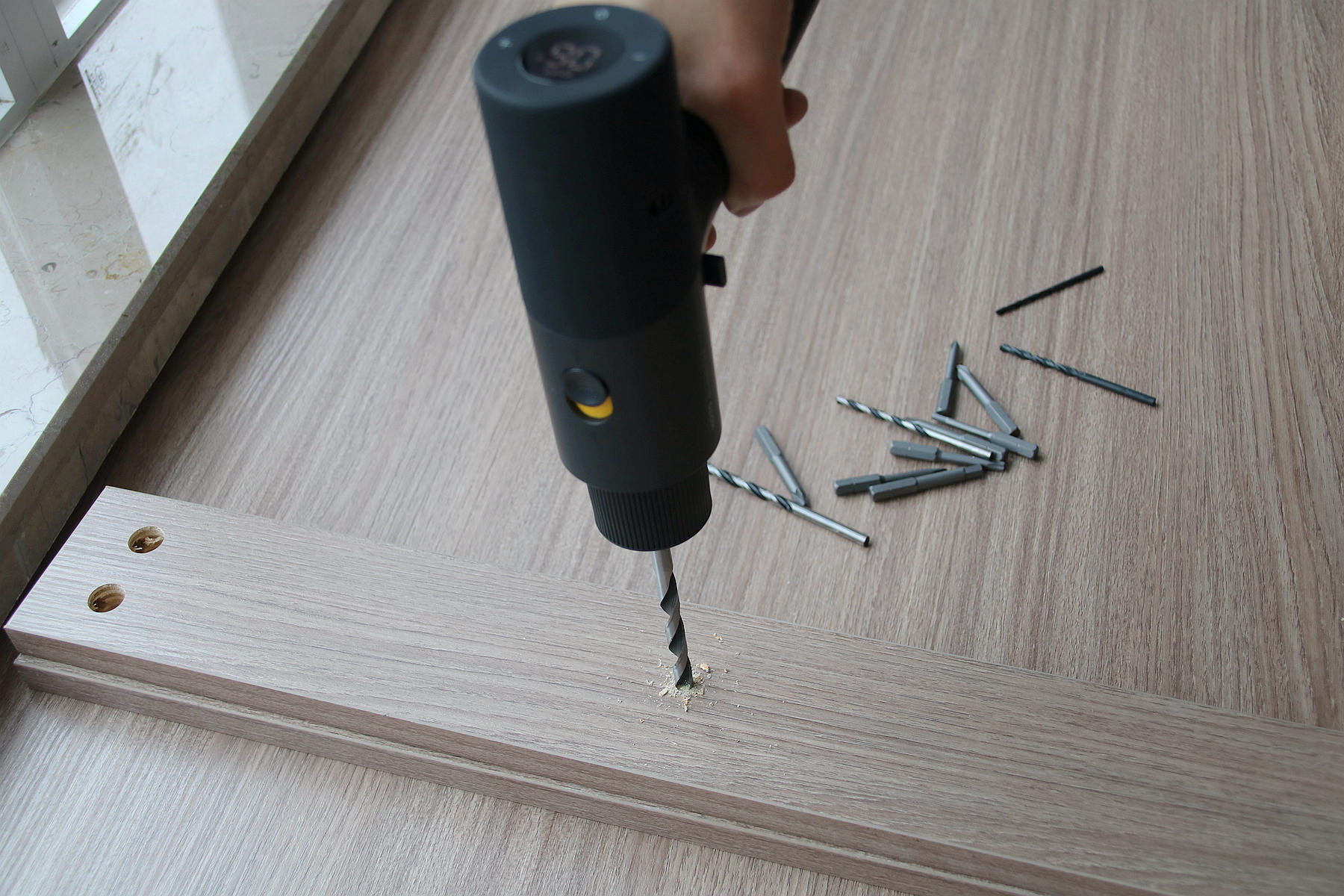 开发商送的灯都是那种比较水的吸顶灯,我第一时间都换了自己喜欢的吸顶灯,而安装吸顶灯就需要钻孔才能安装,有了小猴12V无刷电钻后这些问题轻松解决,测试了一下小猴12V无刷电钻的钻孔效果,可以看到钻木头是非常轻松的,几秒钟就能轻松将其钻穿,像我这种新家入住自己用剩下的板材做一个花架是非常不错的选择。