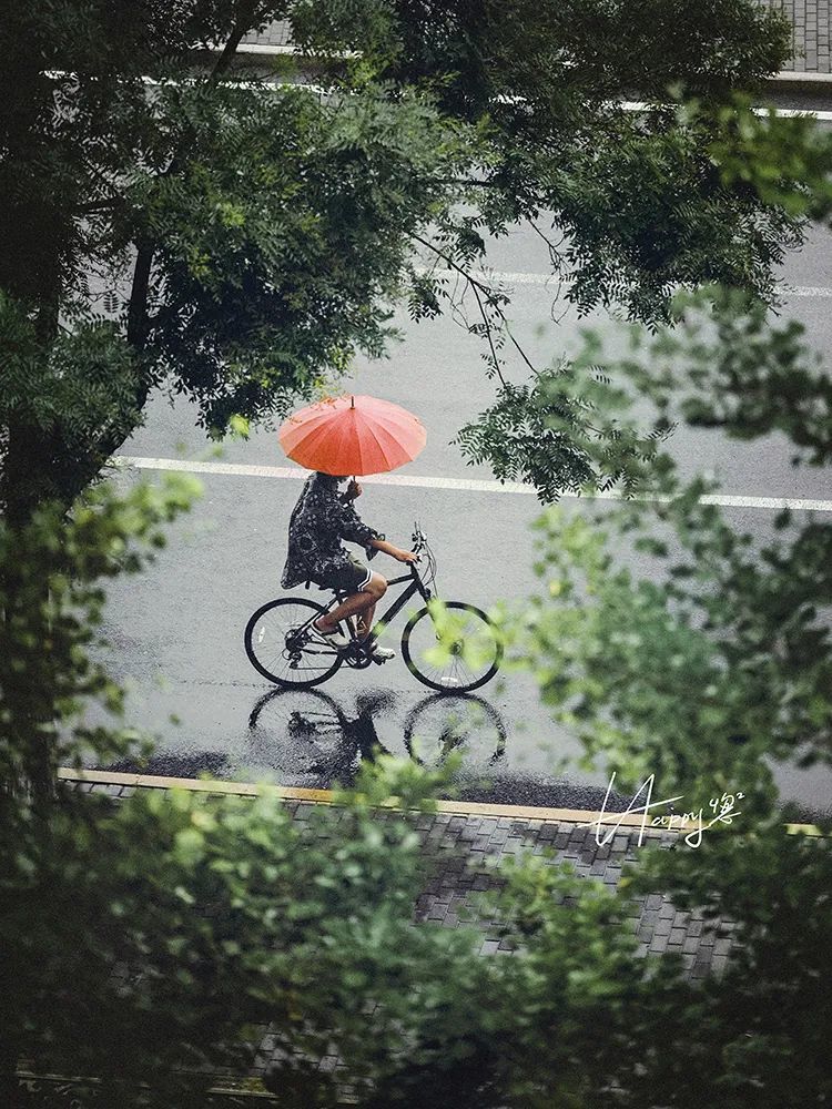“扫街”很多时候需要用到运气,但也有很多时候需要的是耐心与预判。如上图,我站在高处,用长焦镜头透过树叶的缝隙形成框架式构图,一直等到刚好有一辆自行车经过按下快门,恰好在湿滑的地面上有个倒影。如此一来,一张自己很满意的作品也就意外而又必然地出现了。