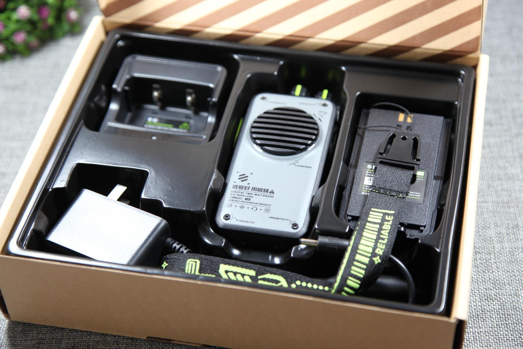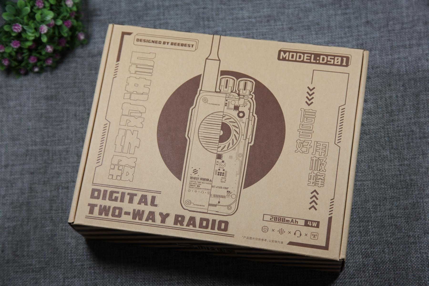 ▲这款极蜂D501数字对讲机的包装也非常有个性,并且在包装上标注了很多对讲机的特性,比如2000mAh的电池以及4W的发射功率等等。