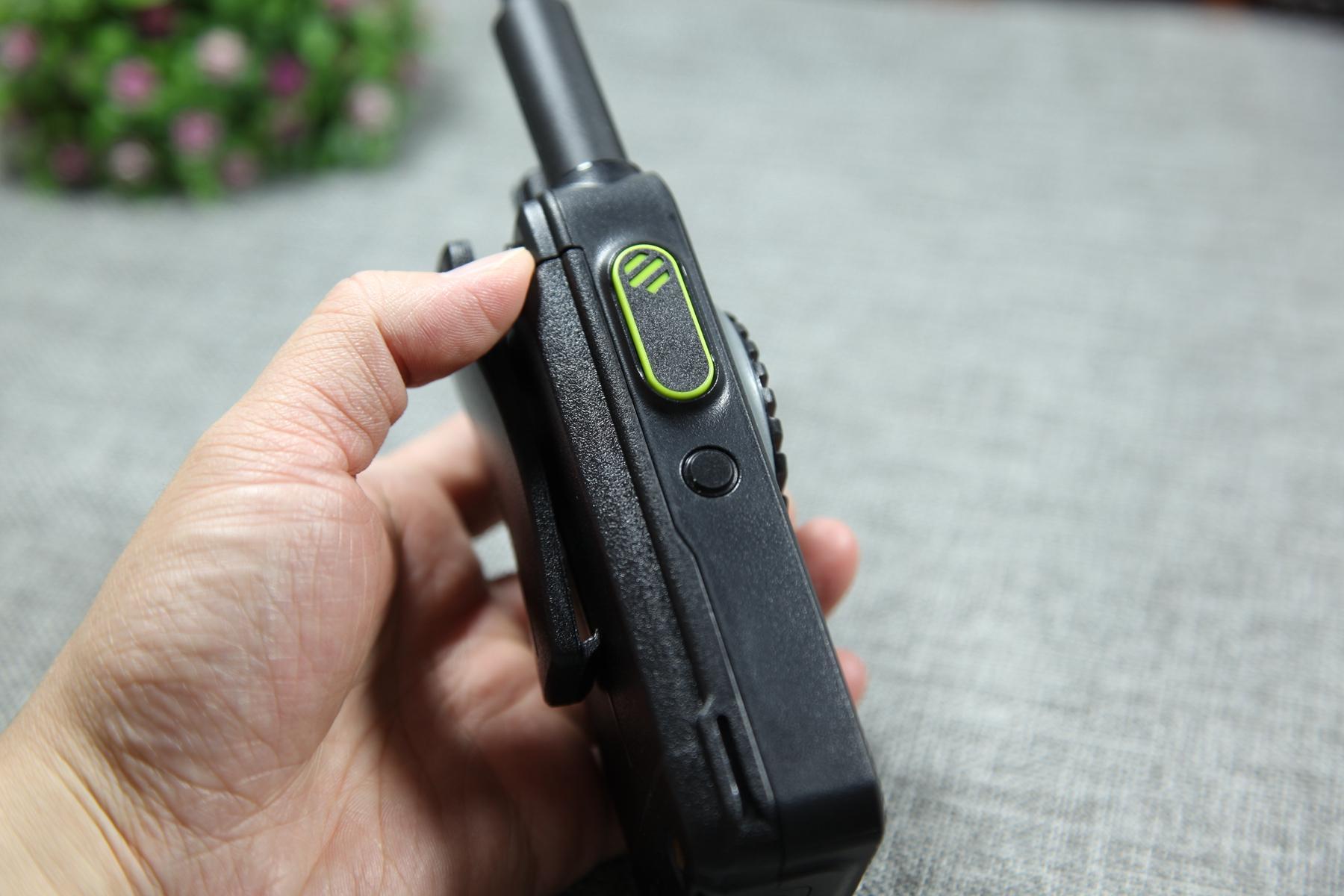 ▲这款极蜂D501数字对讲机身体机身设计非常简洁,左侧上方按钮为PTT(push to talk)发射按键,按键上有极蜂logo,手感清脆,使用时建议在发射按键中间位置发力。PTT发射键下方还有一颗圆形的自定义按钮,用户可以根据自己的使用需求设置成不同的功能,不过这个按钮功能的设置需要使用写频线连接到电脑写频软件来设置。