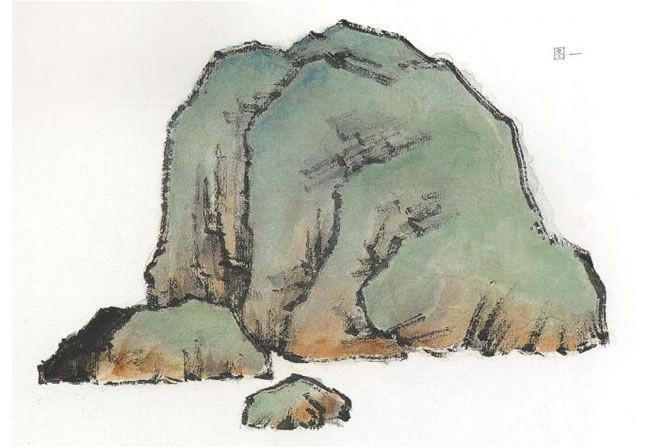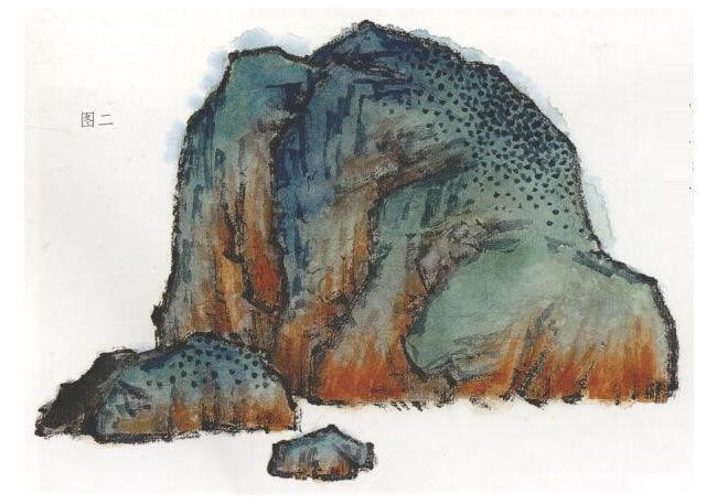 图二、按山石色调,用深一级的同样色调,加以勾皱最后用汁绿点苔(汁绿可偏黑或偏绿,均视画面需要而定),亦可不画苔点。