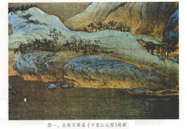 图一是北宋王希孟《千里江山图》局部。此图墨骨勾皱十分完备,山峦大小、石块布置错落有致。山石上部以汁绿打底,渐接赭色。敷染石青、石绿厚重而不腻,色调转换自然,是大青绿山水的典范作品