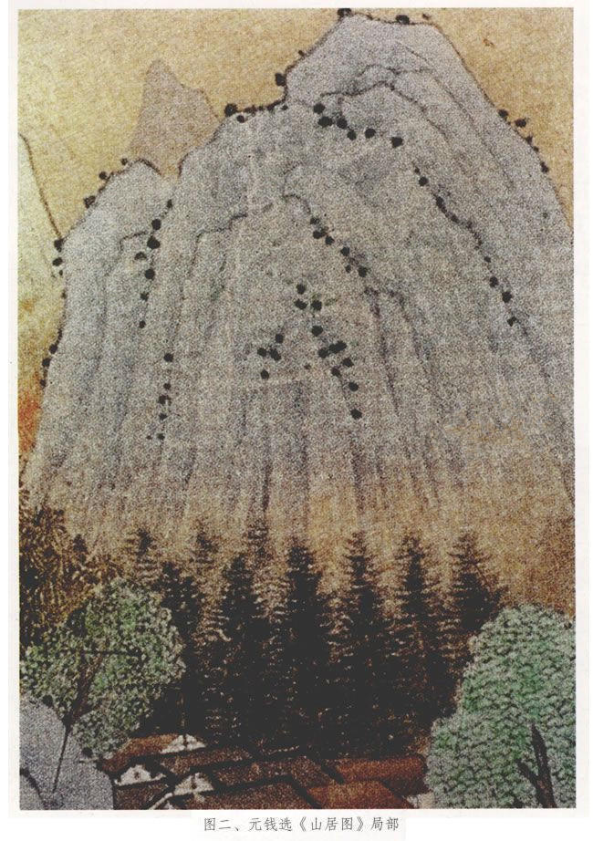 图二是元代钱选《山居图》局部。此图勾线简约硬直,敷染淡雅清丽而十分古拙。山峦勾线与深色苔点,结合成几近图案装饰的效果,更显恬淡平整。