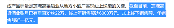 日前,有媒体以《以电子商务示范引领工程推动实体经济加速转型》为题发文,其中提到:“莲塘高粱酒业账号已有垂直粉丝22万,线上年销售额达6000万元,加上线下销售额,年销售额近一亿元。”