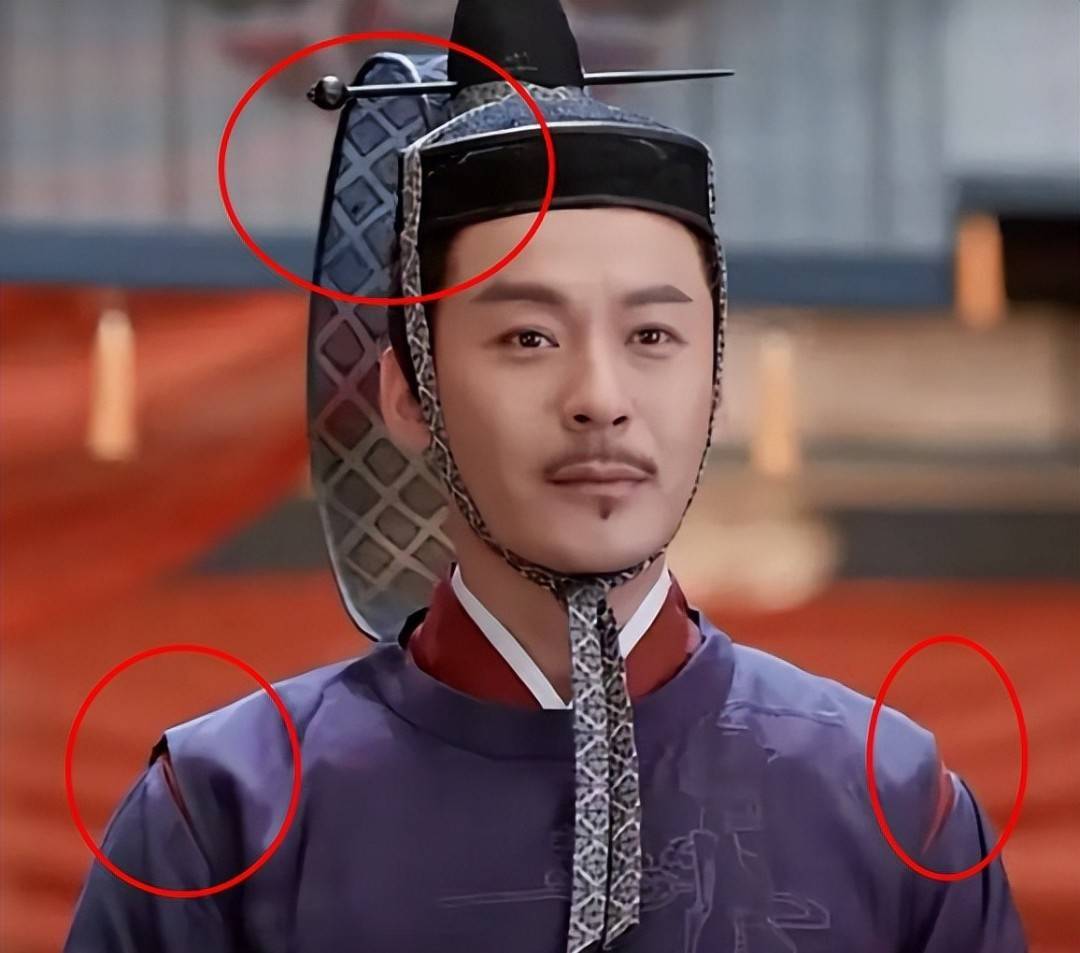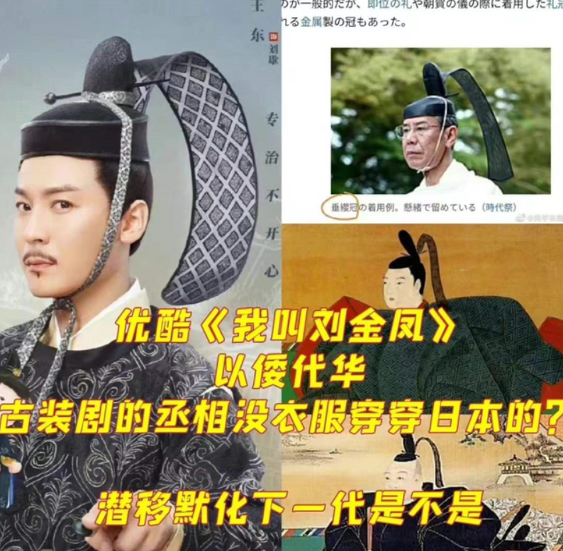 而除了女主辣目洋子的服饰之外,男演员的服饰也是一股浓浓的倭国风,特别是男演员王东的那身更是倭国古代的公卿服饰,头顶上戴的奇怪帽子则是日式的「垂缨冠」。
