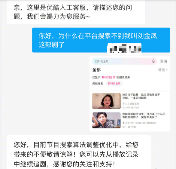 随后,平台客服就此事回应网友,表示只是平台的搜索算法调整进行了优化,用户可以先从播放记录中继续追剧。所以,从这回应来看,平台并没有下架《我叫刘金凤》,只是做了些技术处理,甚至还有可能不是针对《我叫刘金凤》特意做的处理,而是刚好遇到系统优化而已,所以大家是空欢喜一场了。