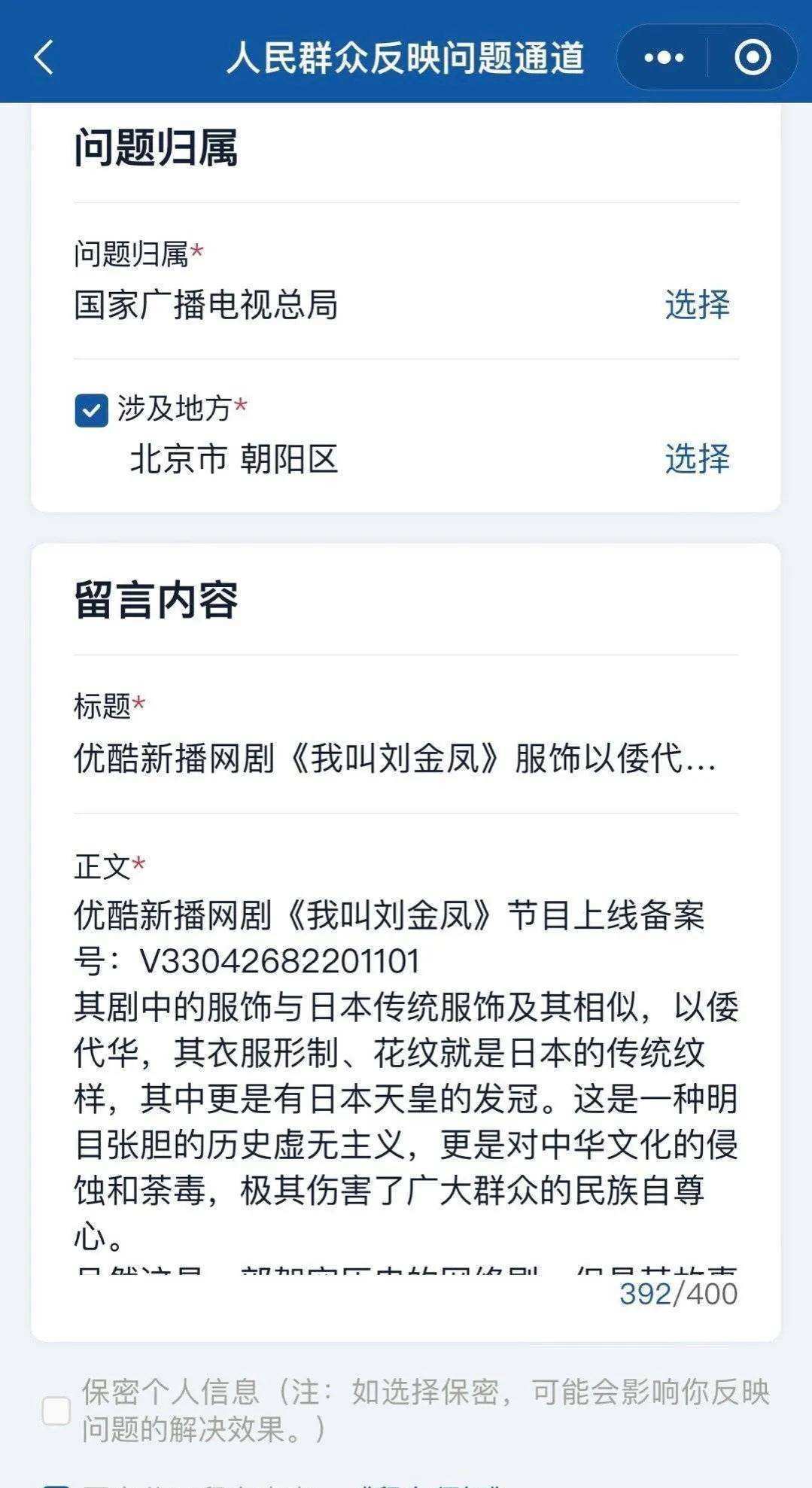 可能正是这些元素惹怒了网友,网友们纷纷跑去广电总局那边留言,要求下架这部「以倭代华」的剧集。于是就出现了上边有网友发现在视频平台搜不到该剧情的事情,疑似已经下架。