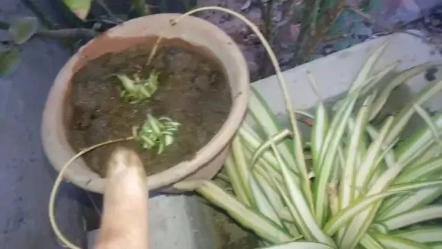 这种繁殖的方法非常简单,不需要花费什么力气,且新手也可以操作,只需要准备一些疏松排水好的土壤,加上一个有较多排水孔的花盆,土壤可以先浇水湿润之后,将匍匐的吊兰分枝压到土壤里,可以用一块小石头压着。