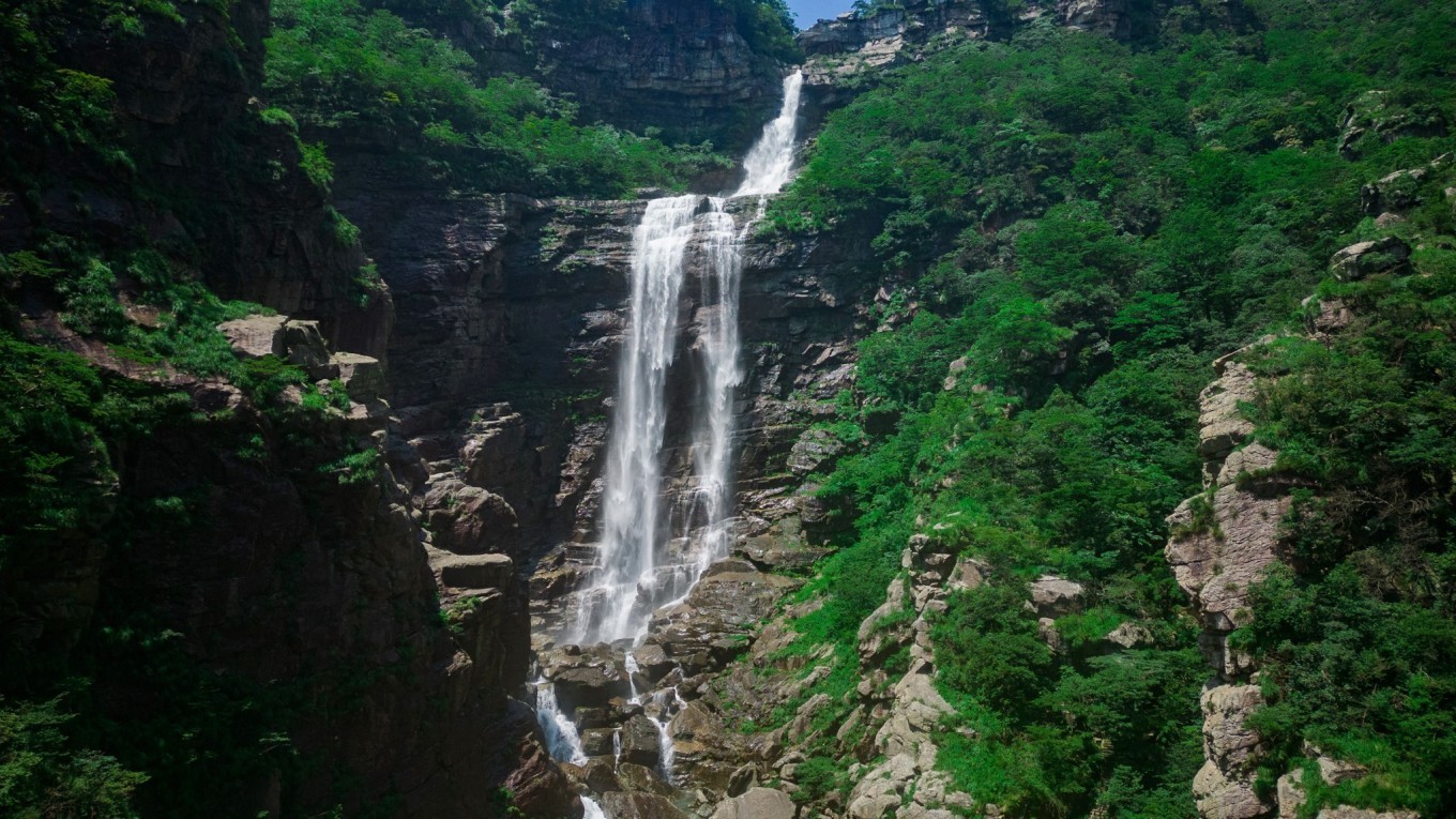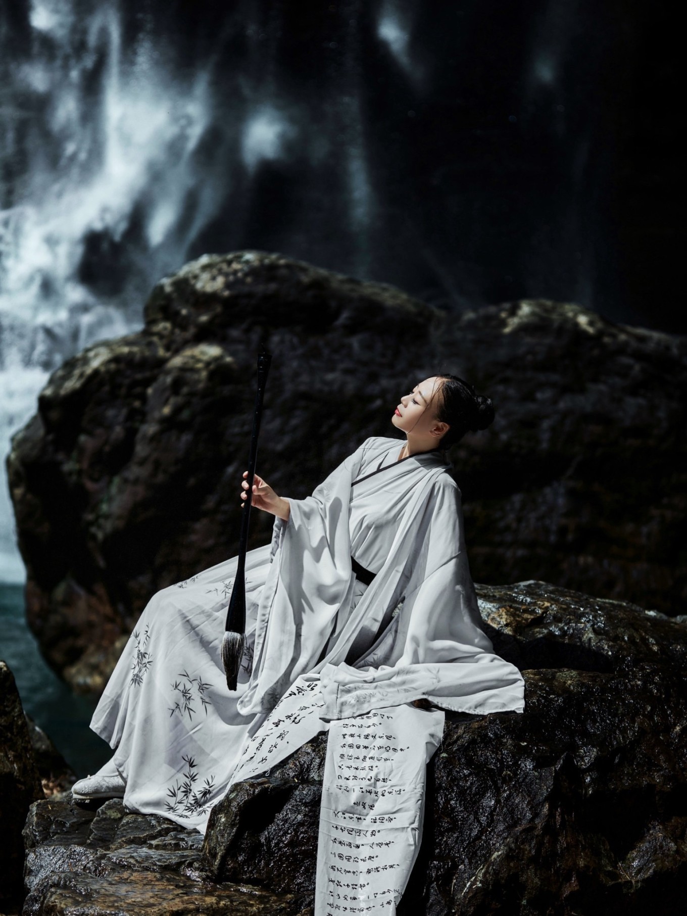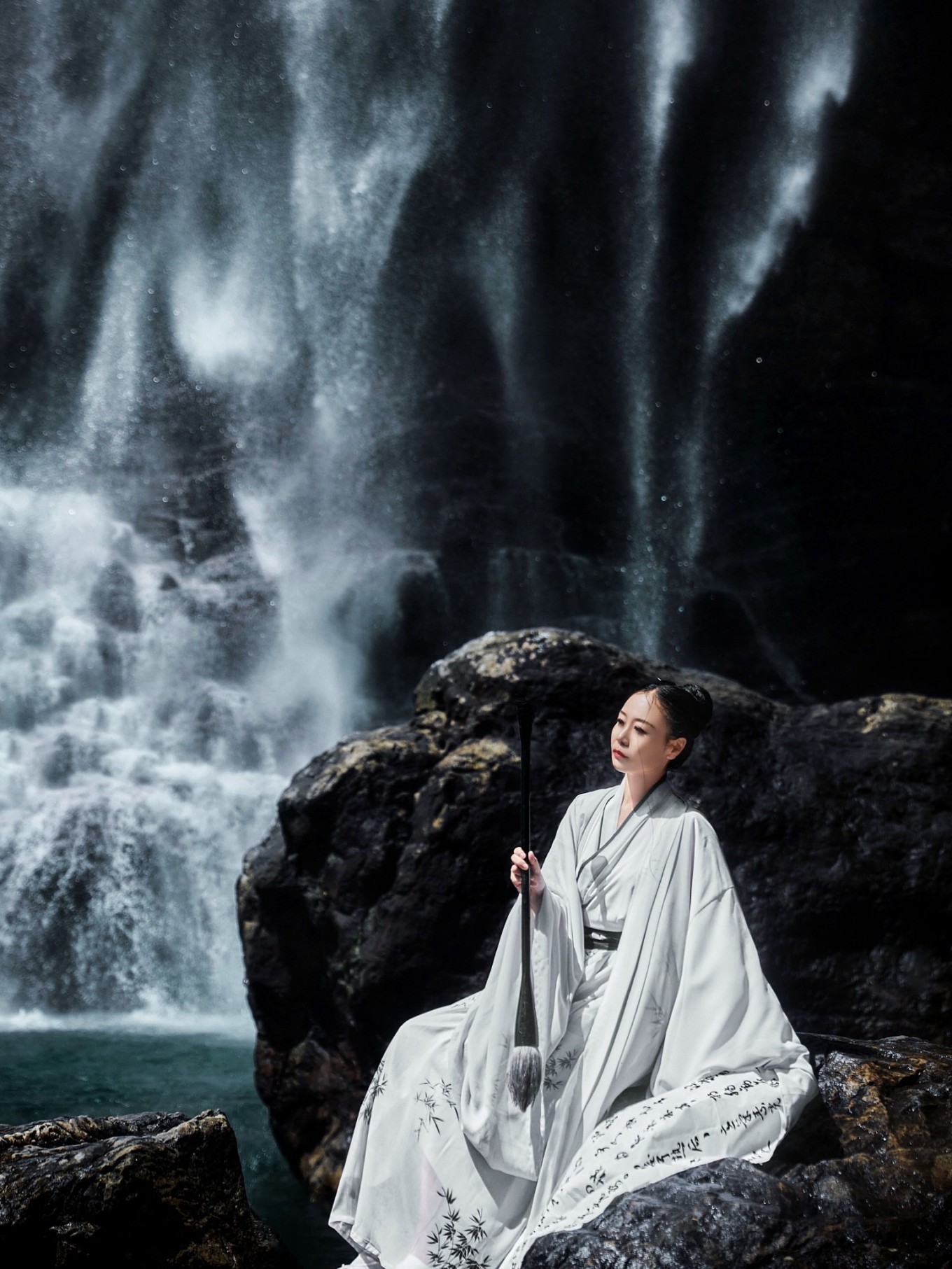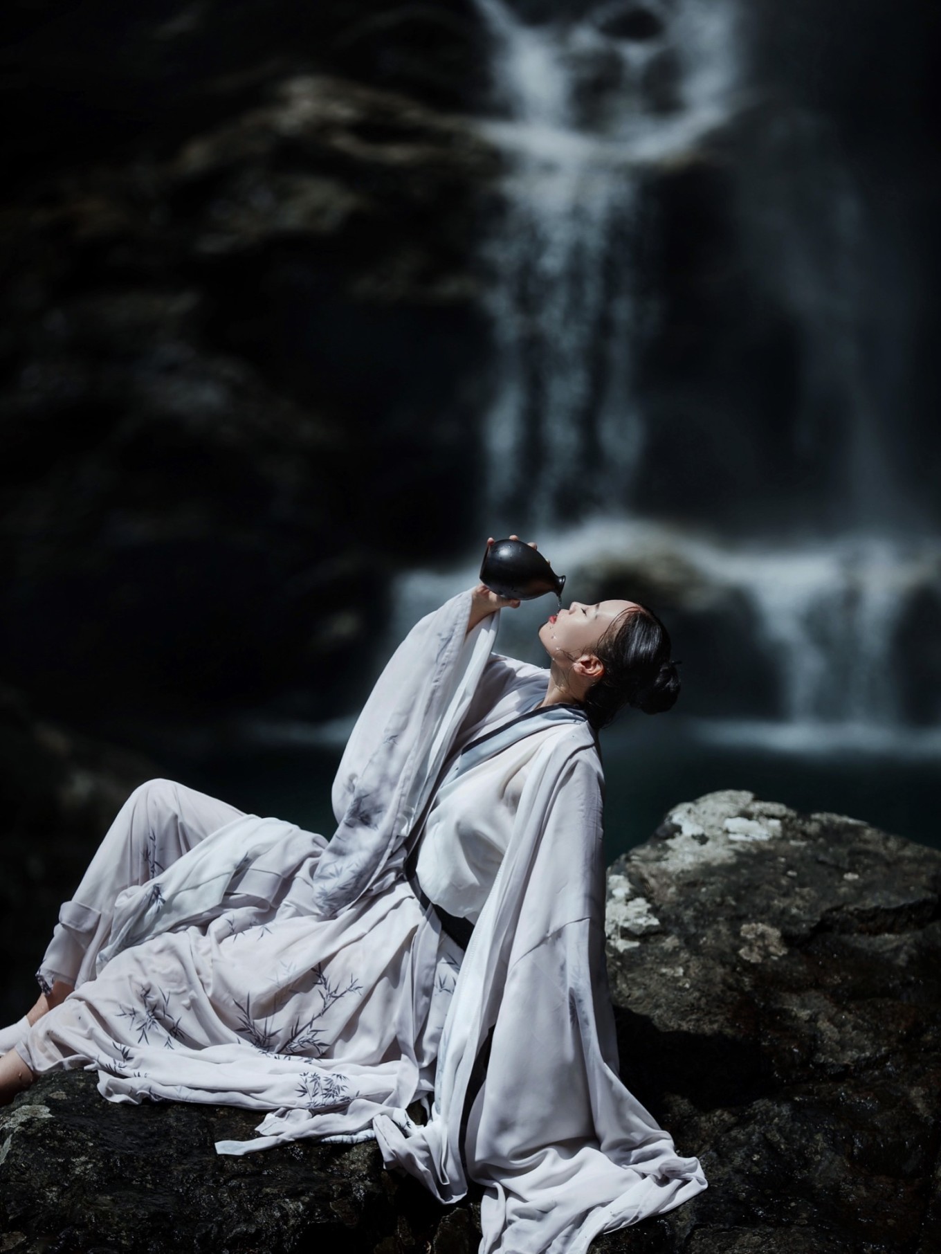 瀑布溪水分三叠,上级如飘雪拖练,中级如碎玉摧冰,下级如玉龙走潭。找到瀑布前的一块岩石,像李白一般饮酒作诗,瀑布的水雾飞溅而来,如梦如幻。