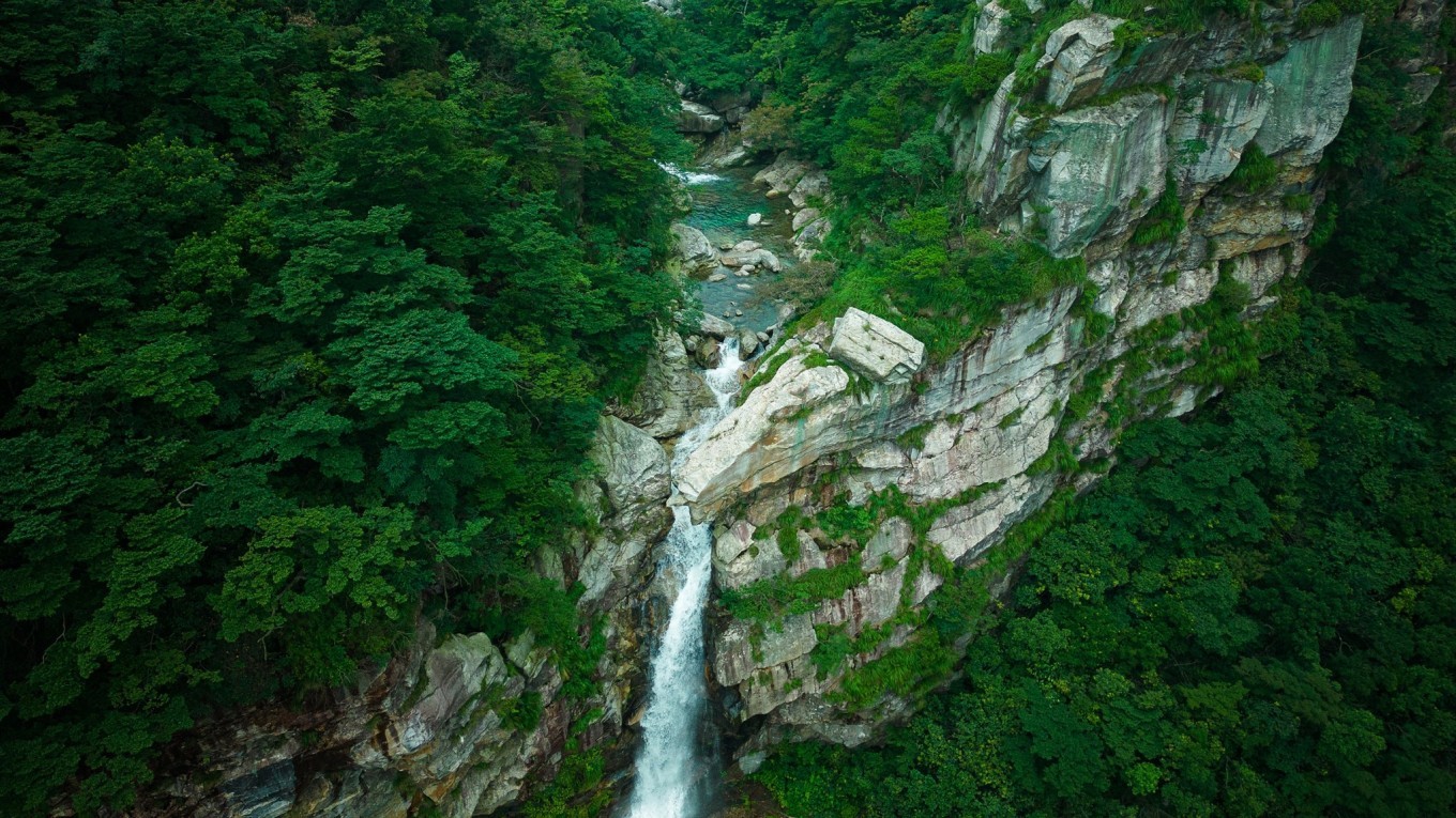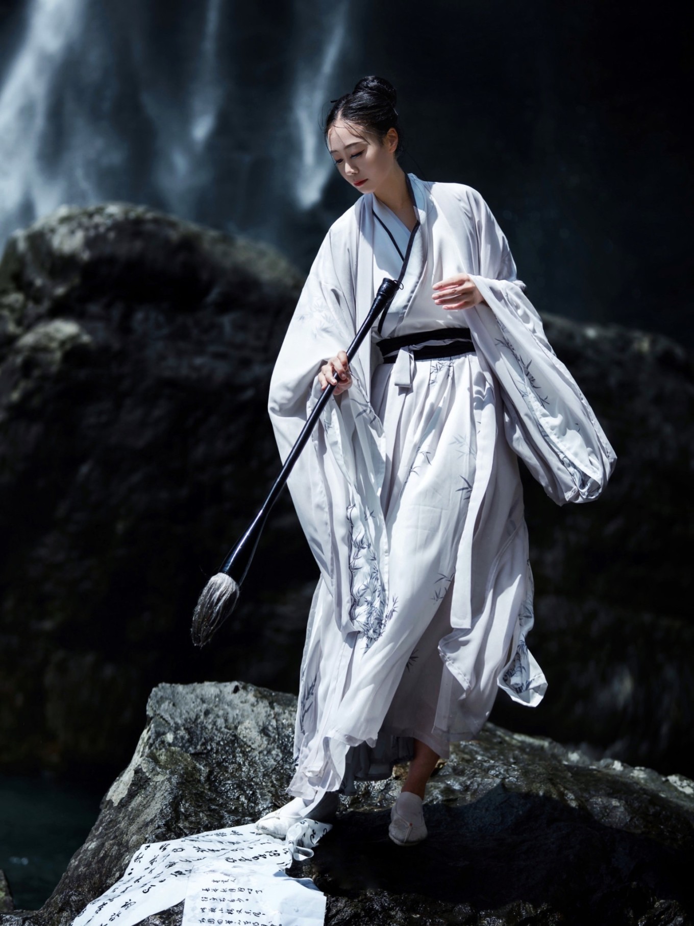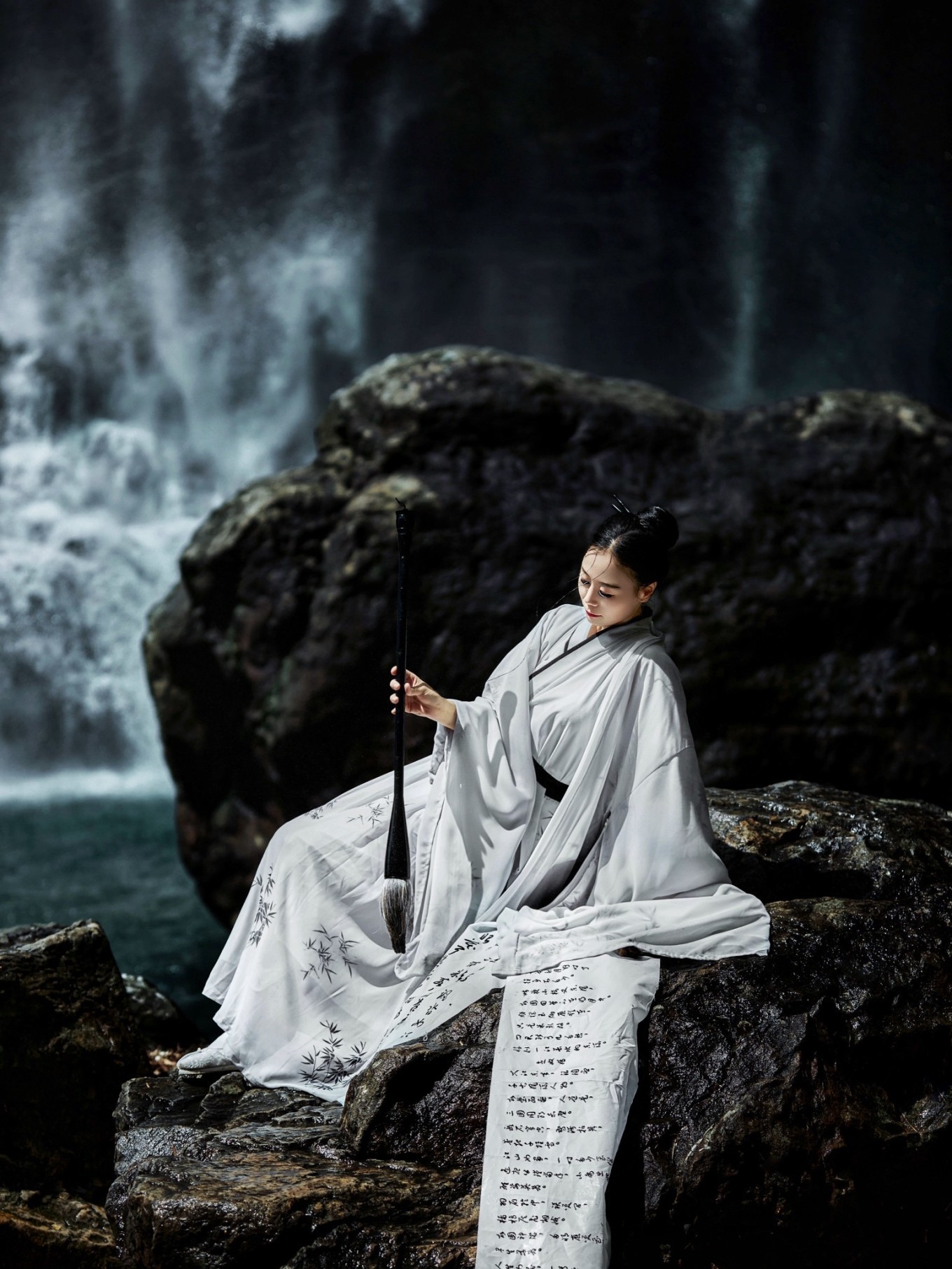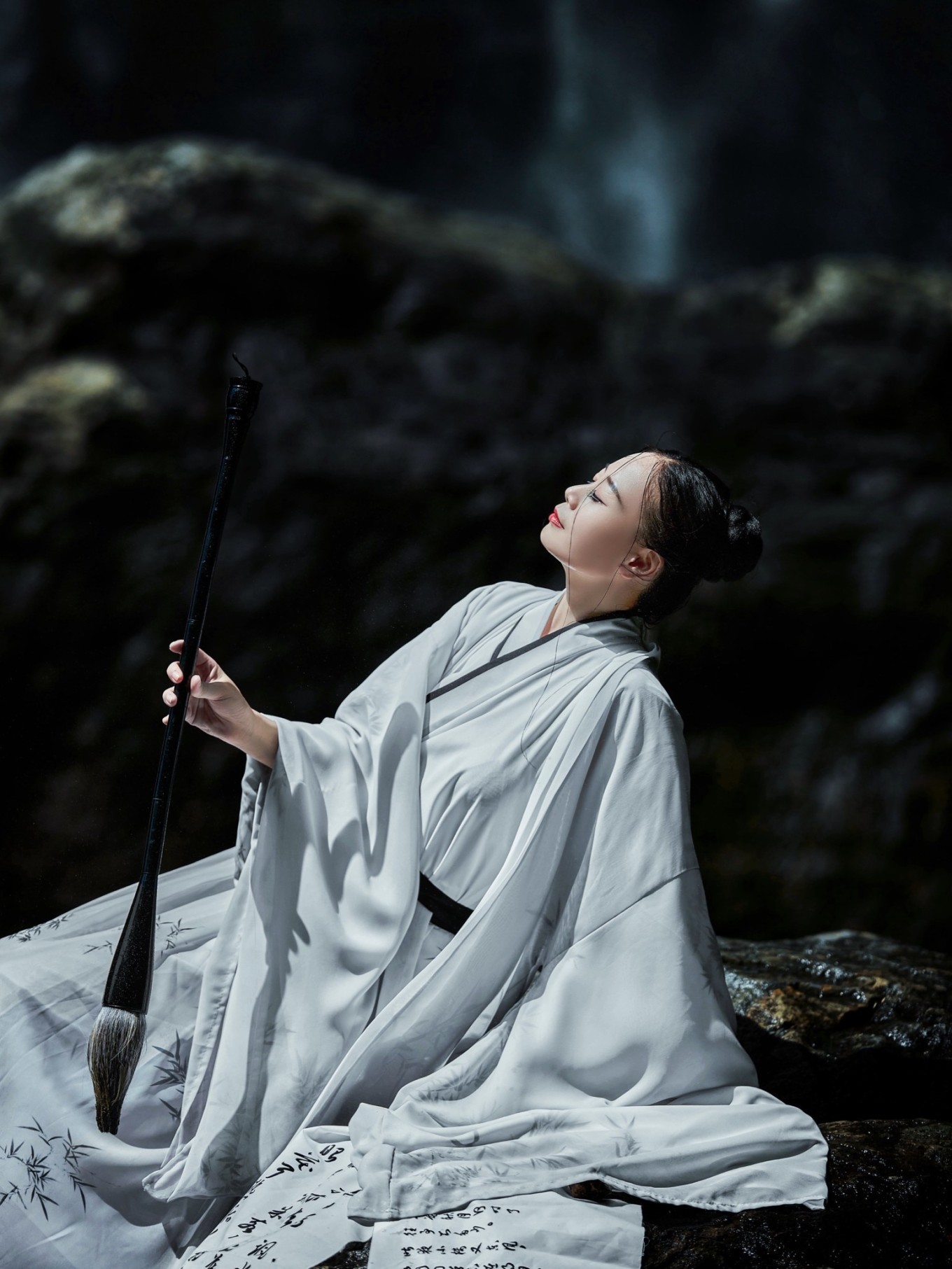 瀑布溪水分三叠,上级如飘雪拖练,中级如碎玉摧冰,下级如玉龙走潭。找到瀑布前的一块岩石,像李白一般饮酒作诗,瀑布的水雾飞溅而来,如梦如幻。