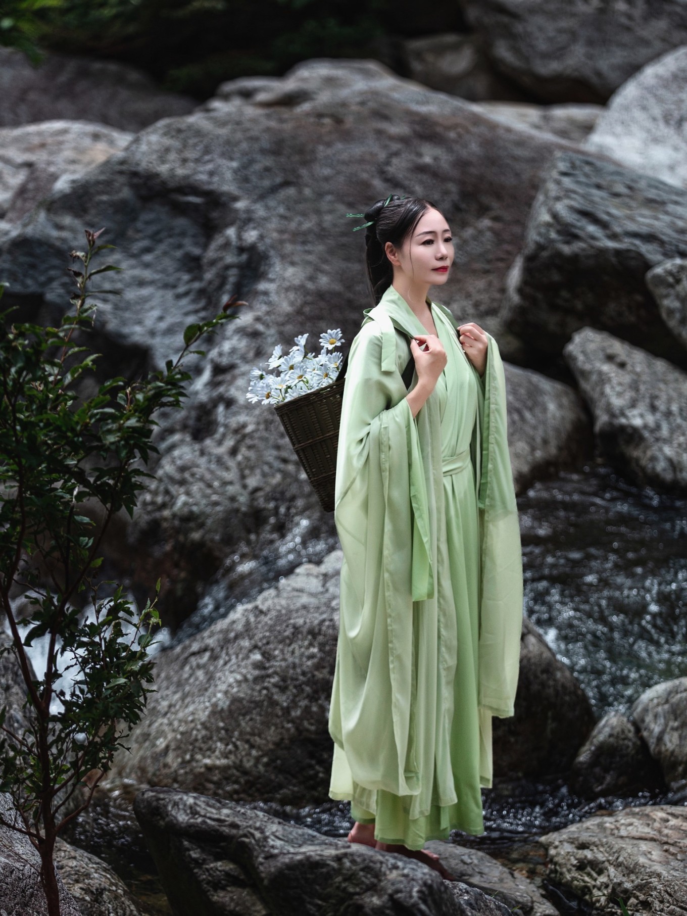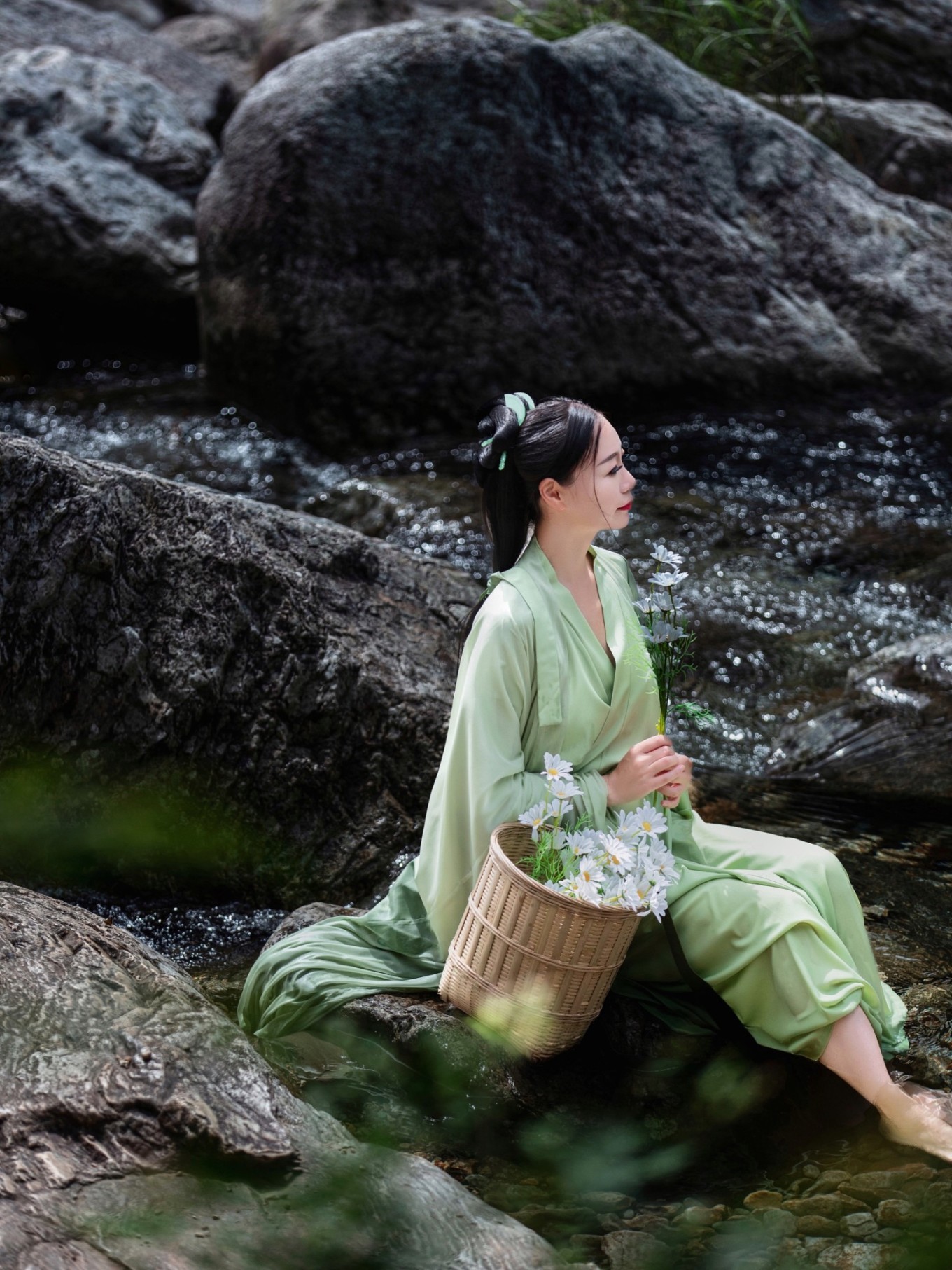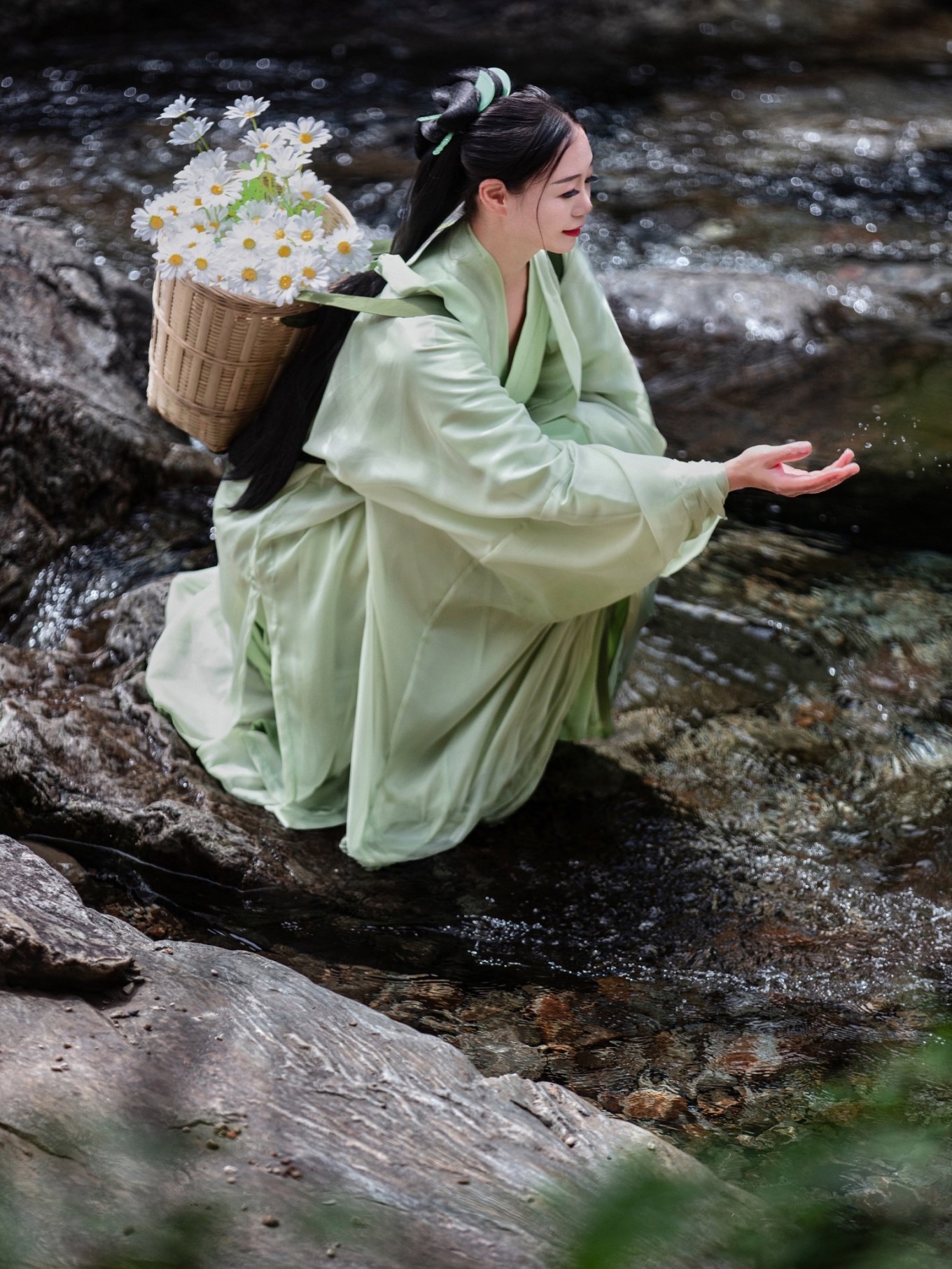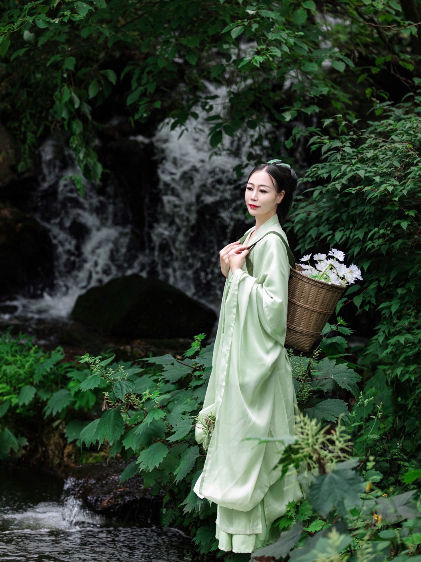 瀑布溪水分三叠,上级如飘雪拖练,中级如碎玉摧冰,下级如玉龙走潭。找到瀑布前的一块岩石,像李白一般饮酒作诗,瀑布的水雾飞溅而来,如梦如幻。