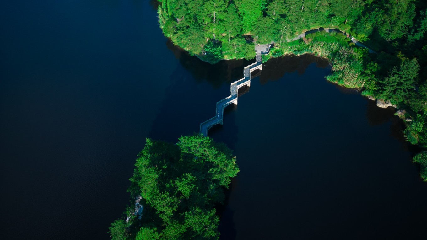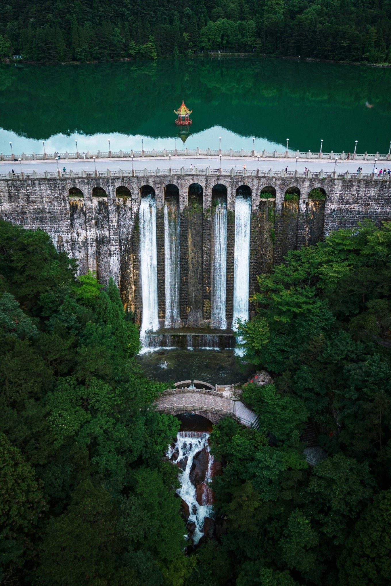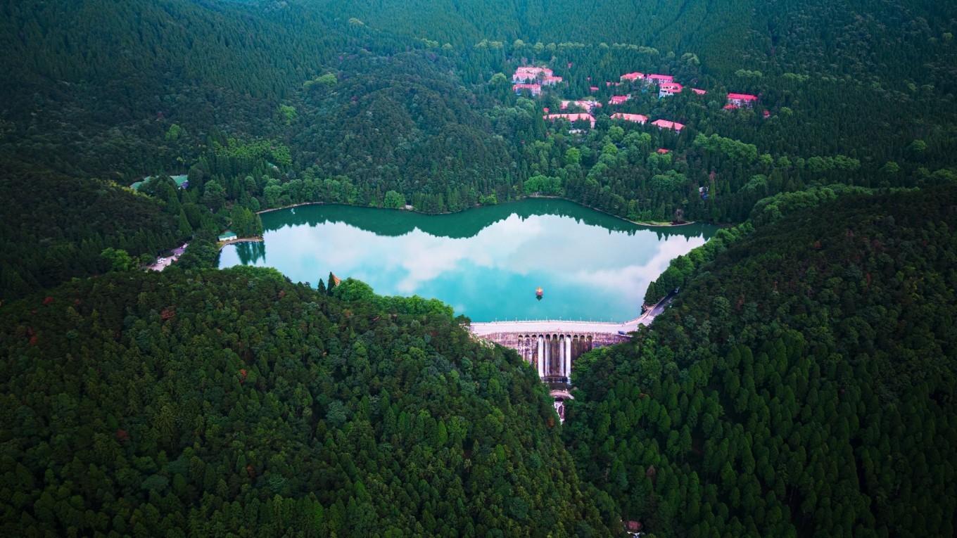 通过航拍视角,能看到整个芦林大桥,其高30米,桥坝一体,拦水成湖,似发光的署玉镶嵌在林萌秀谷之中,美得令人心醉。