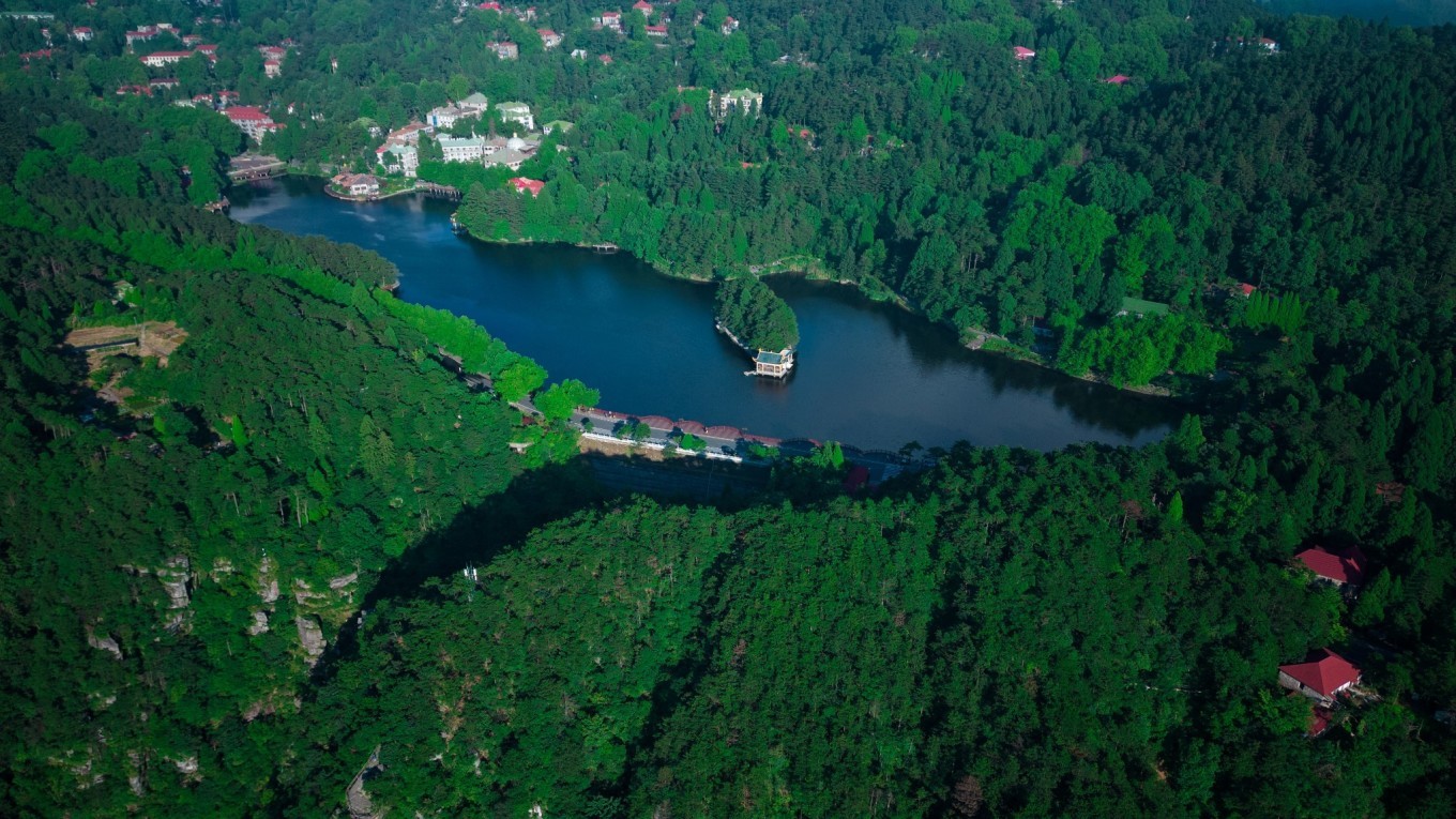 如琴湖,因湖形如琴而得名,湖中有曲桥、亭榭。航拍视角下,湖岸曲线玲珑,湖面似一把小提琴,山树层层,环湖漫步,赏心悦目。