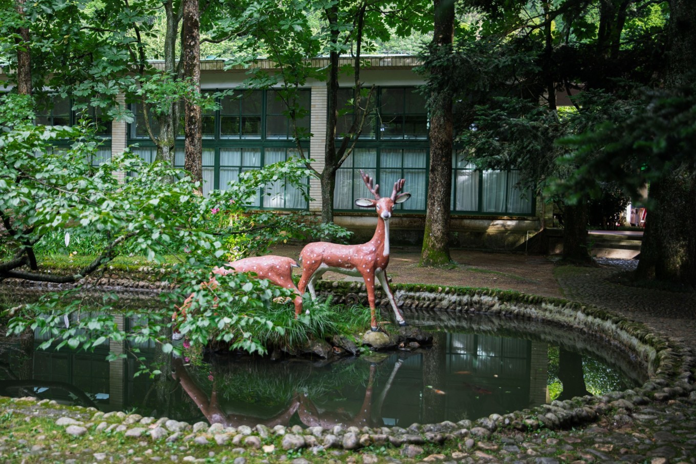 庐山 博物馆位于 庐山 芦林湖畔,九奇峰下,三面环山,背倚芦林湖,风景秀丽,幽绮胜绝。院内林荫蔽日,草坪如茵,不乏珍稀花木, 如 加拿大 铁杉、 日本 金松、云锦杜鹃等,还有喷薄 鹿泉 ,显得清静雅然。
