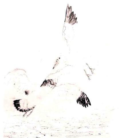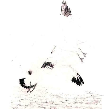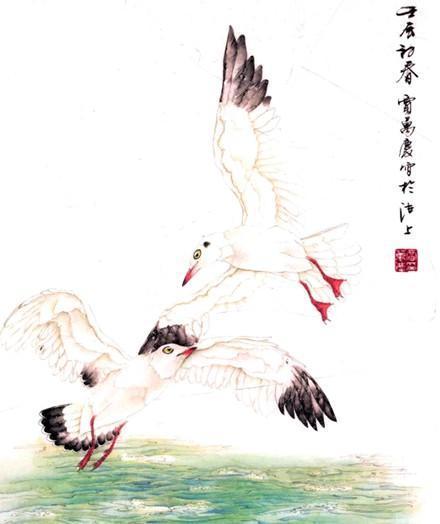 步骤一:两只红嘴鸥盘旋翻卷,起伏于蓝天白云浩瀚琼宇。碧波荡漾,海天浑然,远望去水天一色,,使人陶醉。中墨勾喙、眼、爪,淡墨勾周身翎羽及水纹。浓墨渍染初级飞羽、尾羽,淡墨染喙、爪,逐步加深。
