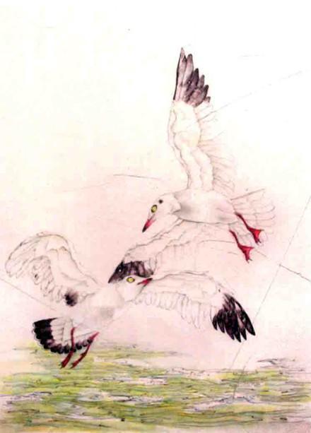 步骤五:白色着重染红嘴鸥前额、胸、腿,后白色丝毛。墨分染初级飞羽,石青分染水,注意整体效果,达到浑然天成。